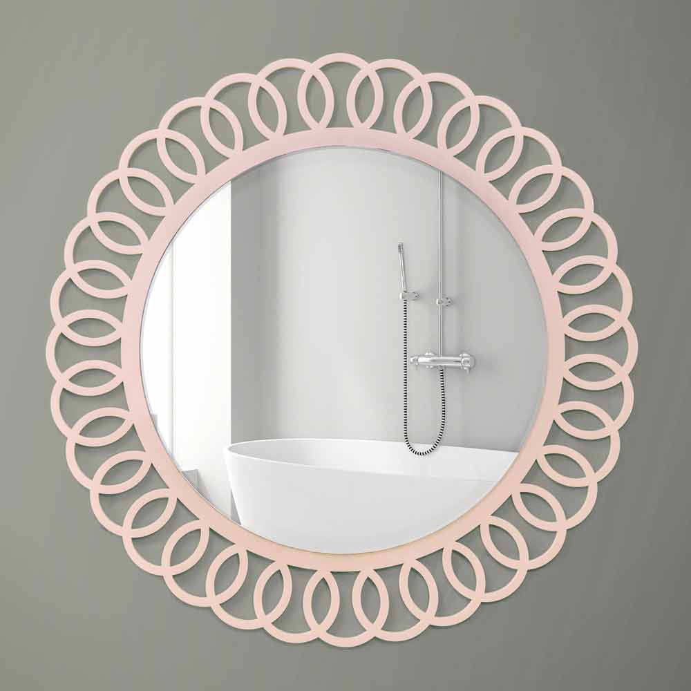 Oglindă rotundă de perete cu cadru roz din lemn cu un design modern făcut în Italia.