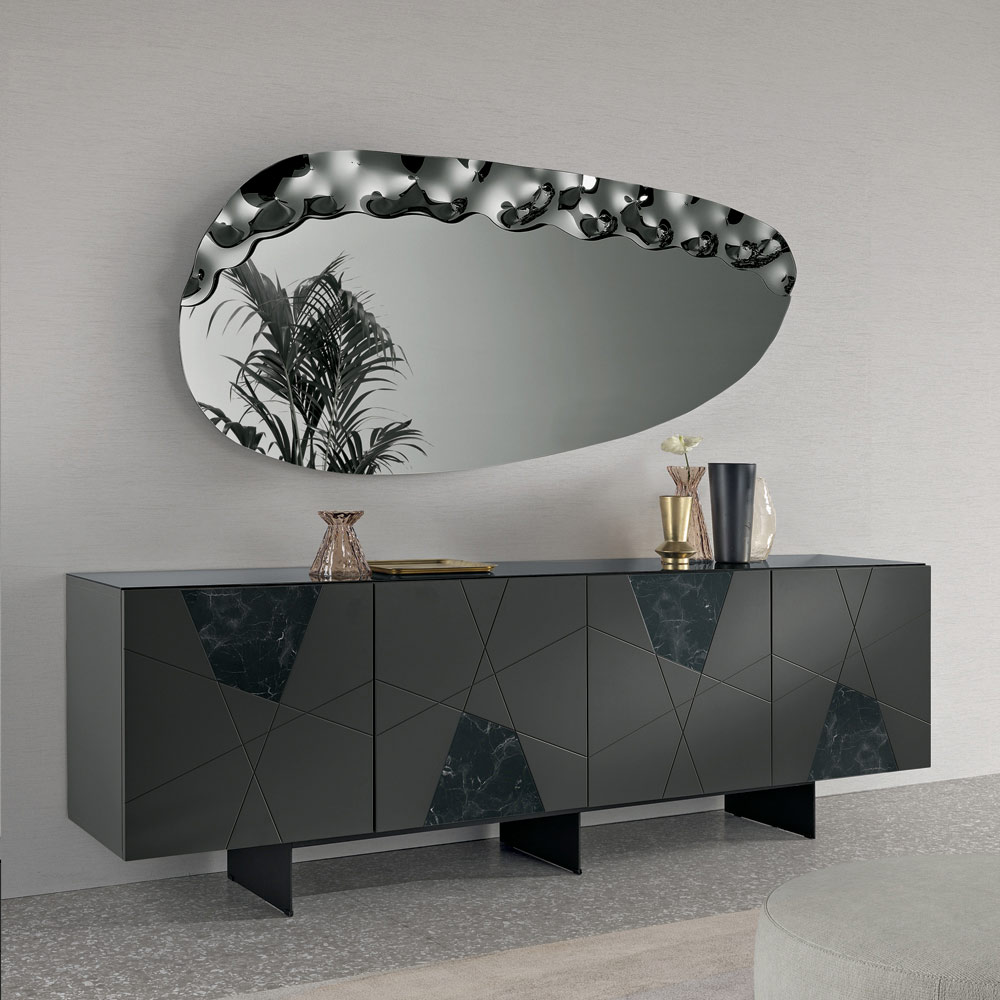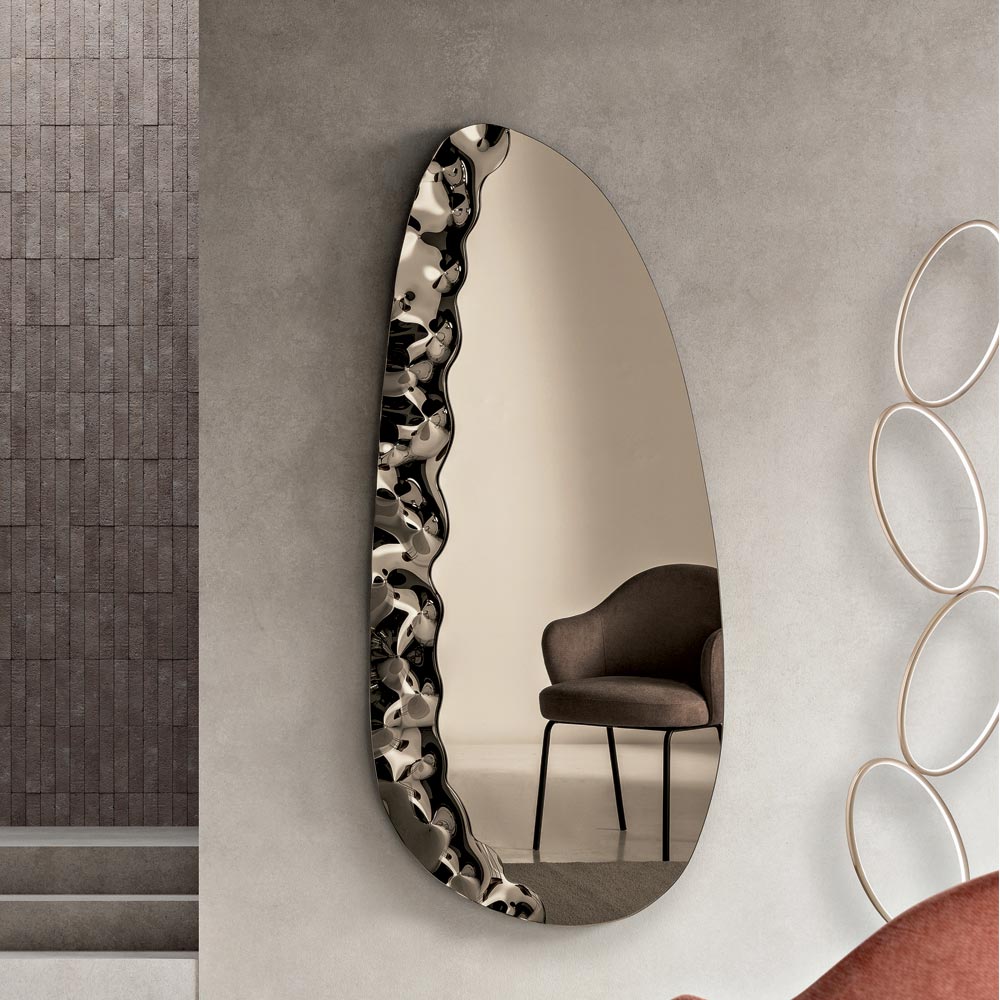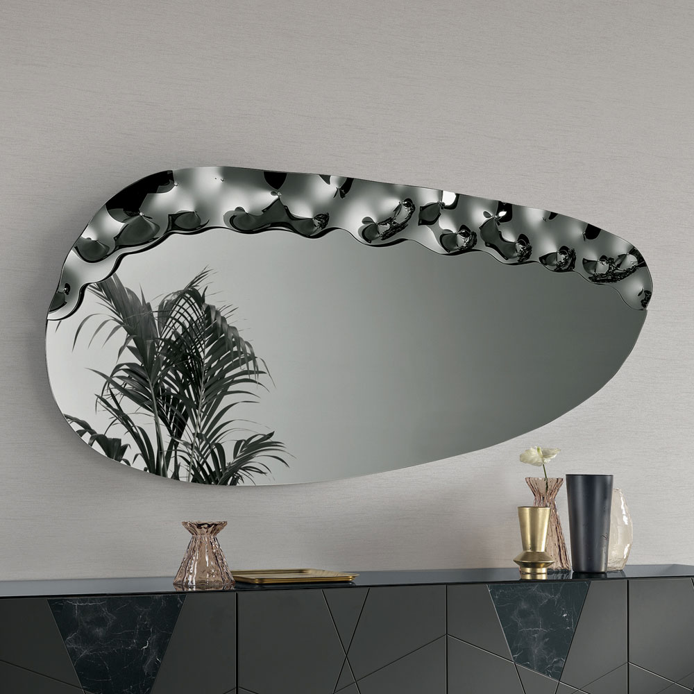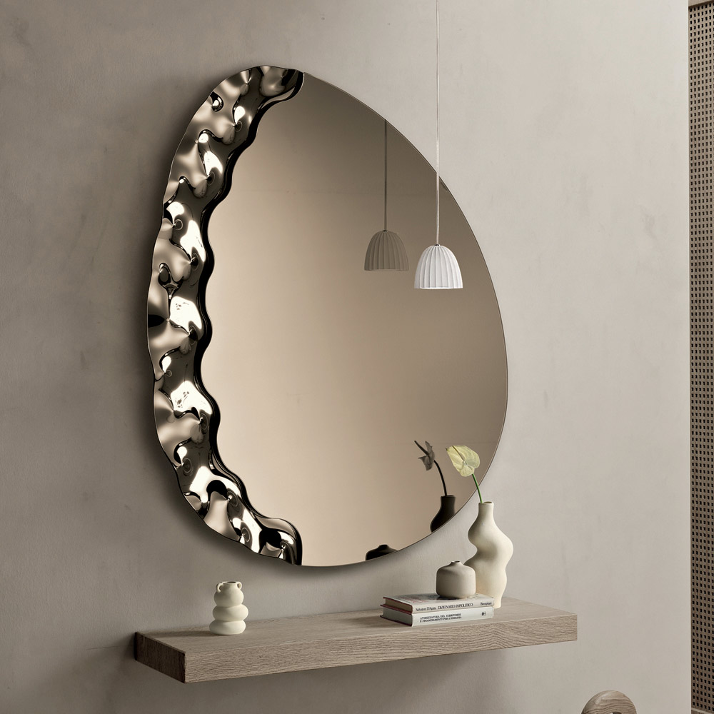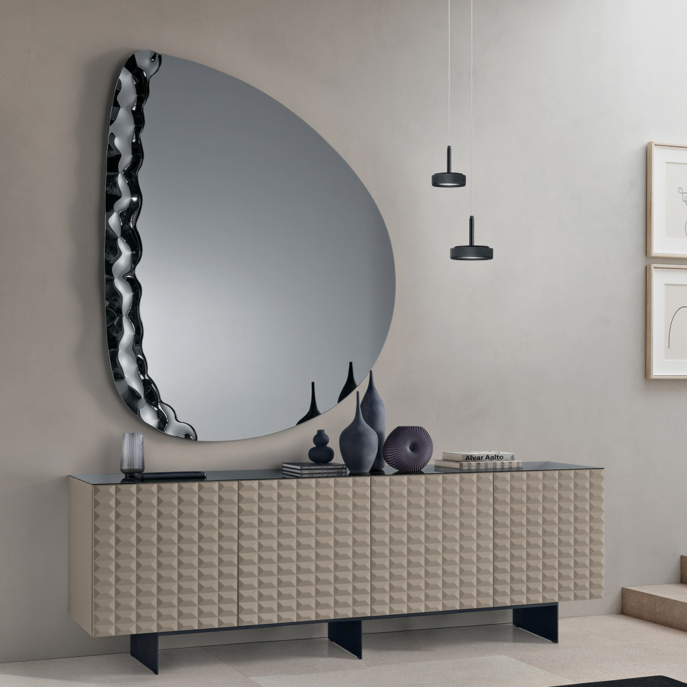 O oglindă elegantă de perete, proiectată în Italia , ideală pentru a înfrumuseța spații precum intrarea , livingul sau dormitorul . Designul său contemporan combină linii delicate și detalii texturate, transformând oglinda într-un element decorativ rafinat, capabil să decoreze elegant peretele.