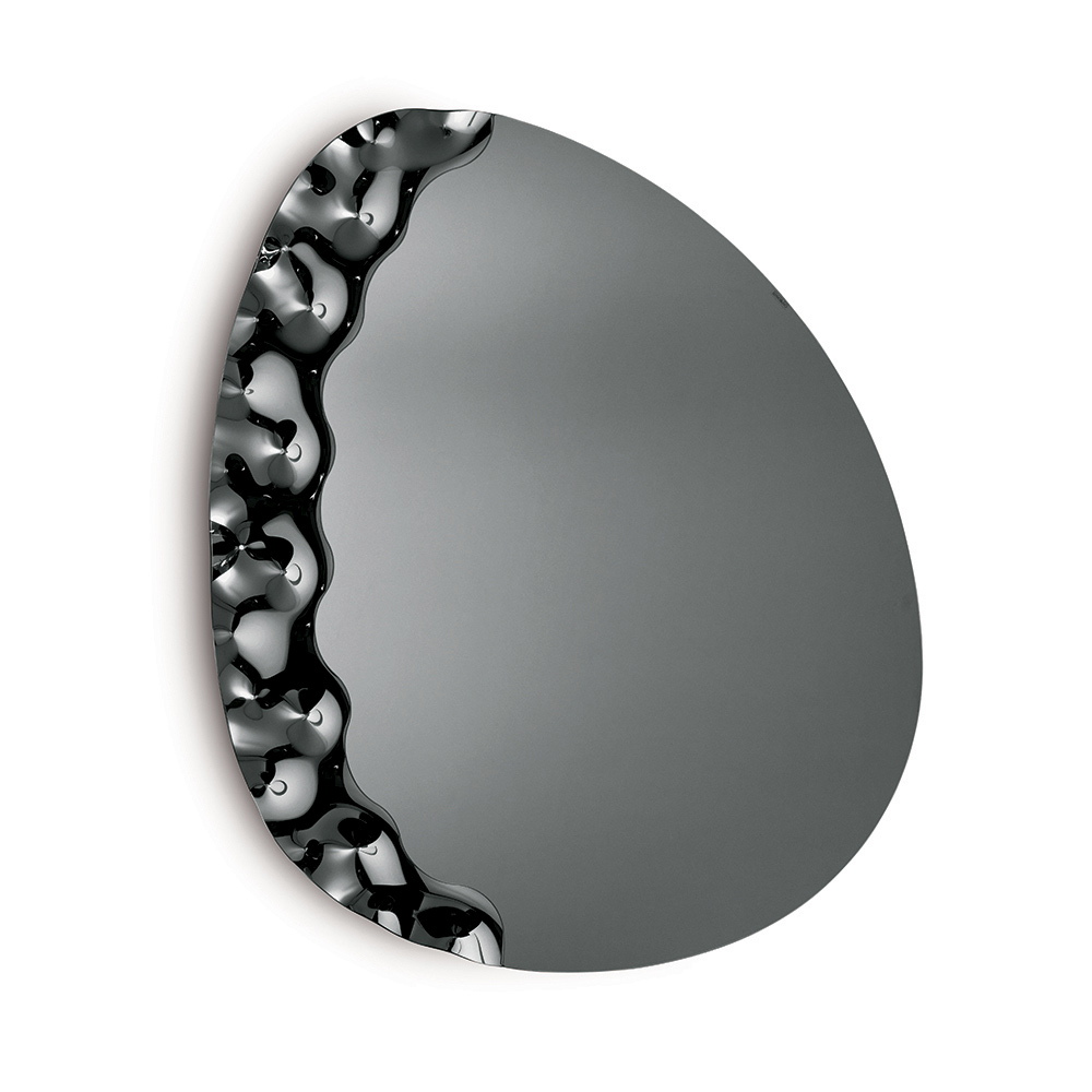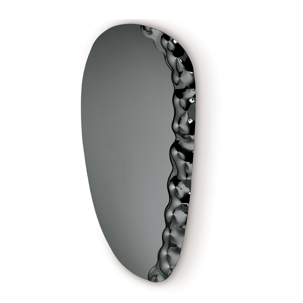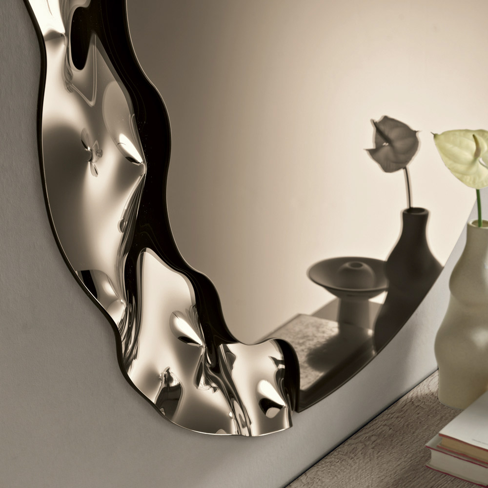 Trăsătura distinctivă a oglinzii este prezența unei inserții laterale din sticlă texturată ton pe ton , creând un joc rafinat de suprafețe și texturi. Acest element decorativ pare să acționeze ca o bază pentru panoul oglindit, generând un efect vizual ușor și sofisticat, care conferă profunzime compoziției.