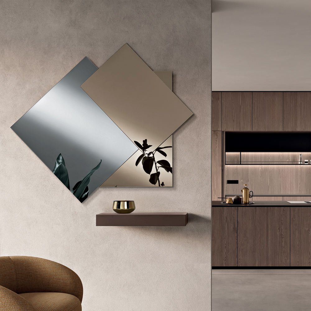 Oglinda este compusă din trei panouri suprapuse care creează un joc rafinat de straturi și reflexii: două elemente cu finisaj bronz și unul cu finisaj fumuriu . Această compoziție creează o suprafață traversată de linii și modele geometrice care conferă profunzime vizuală și mișcare spațiului.