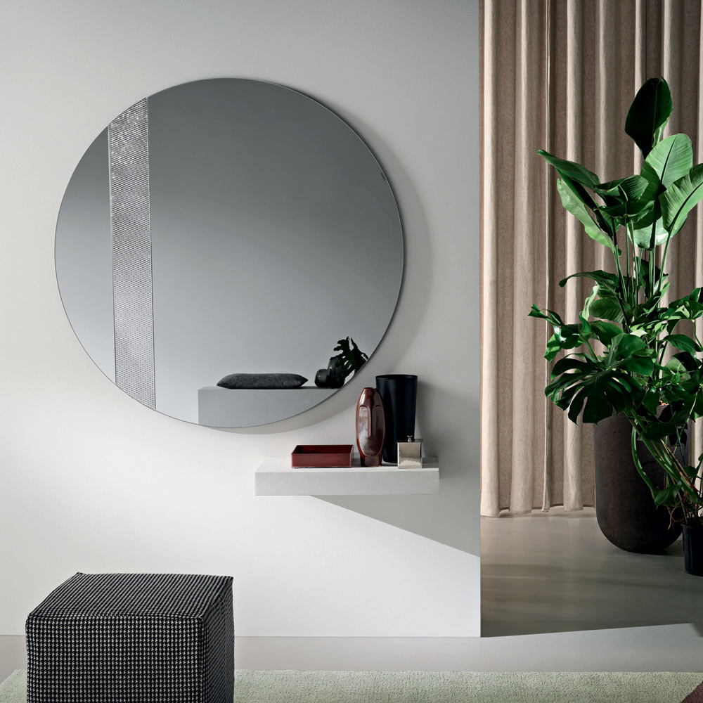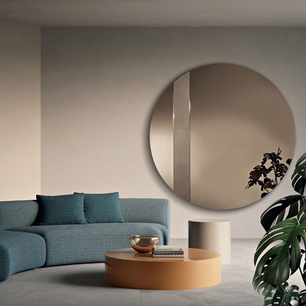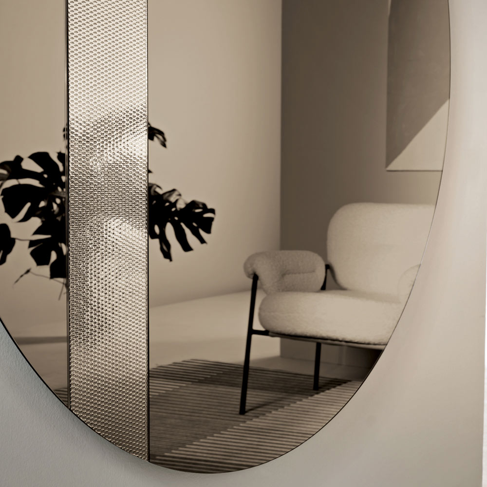 Datorită combinației de linii curate și texturi decorative , oglinda devine un accesoriu de mobilier modern și sofisticat, perfect pentru mediile contemporane în care peretele devine protagonistul spațiului.
