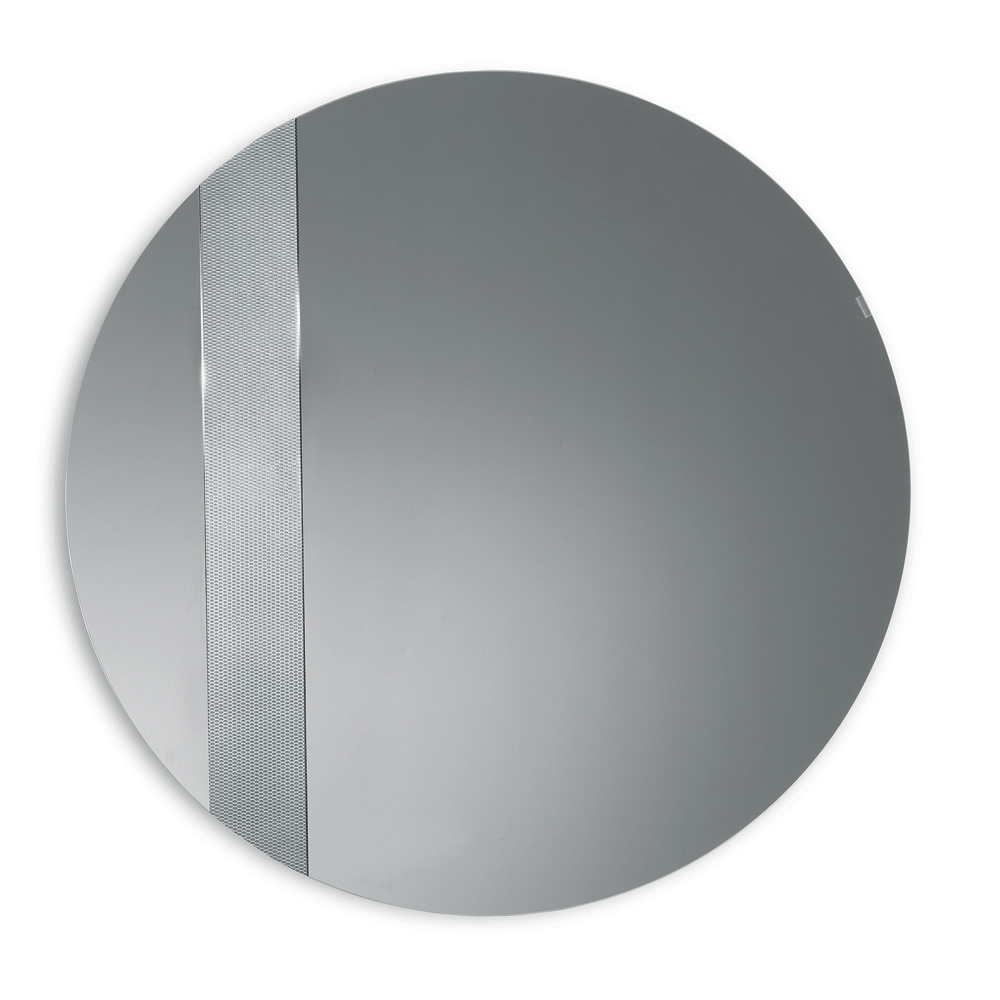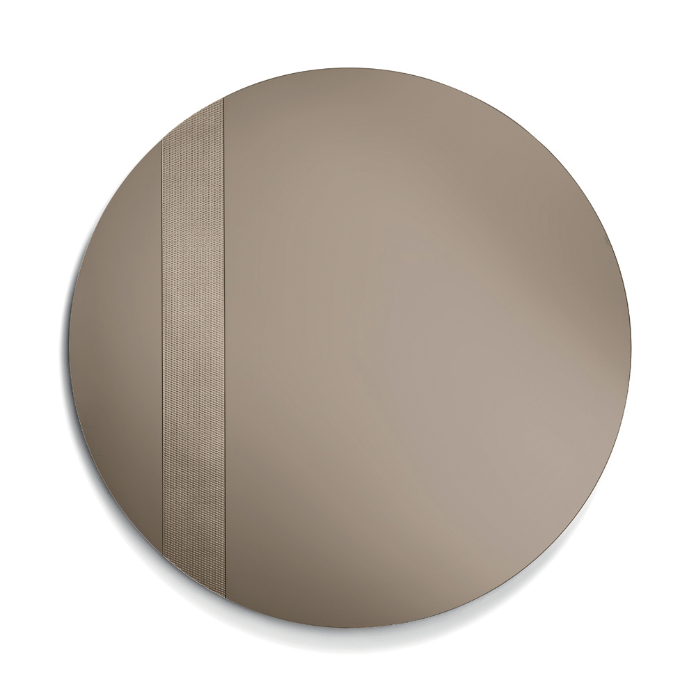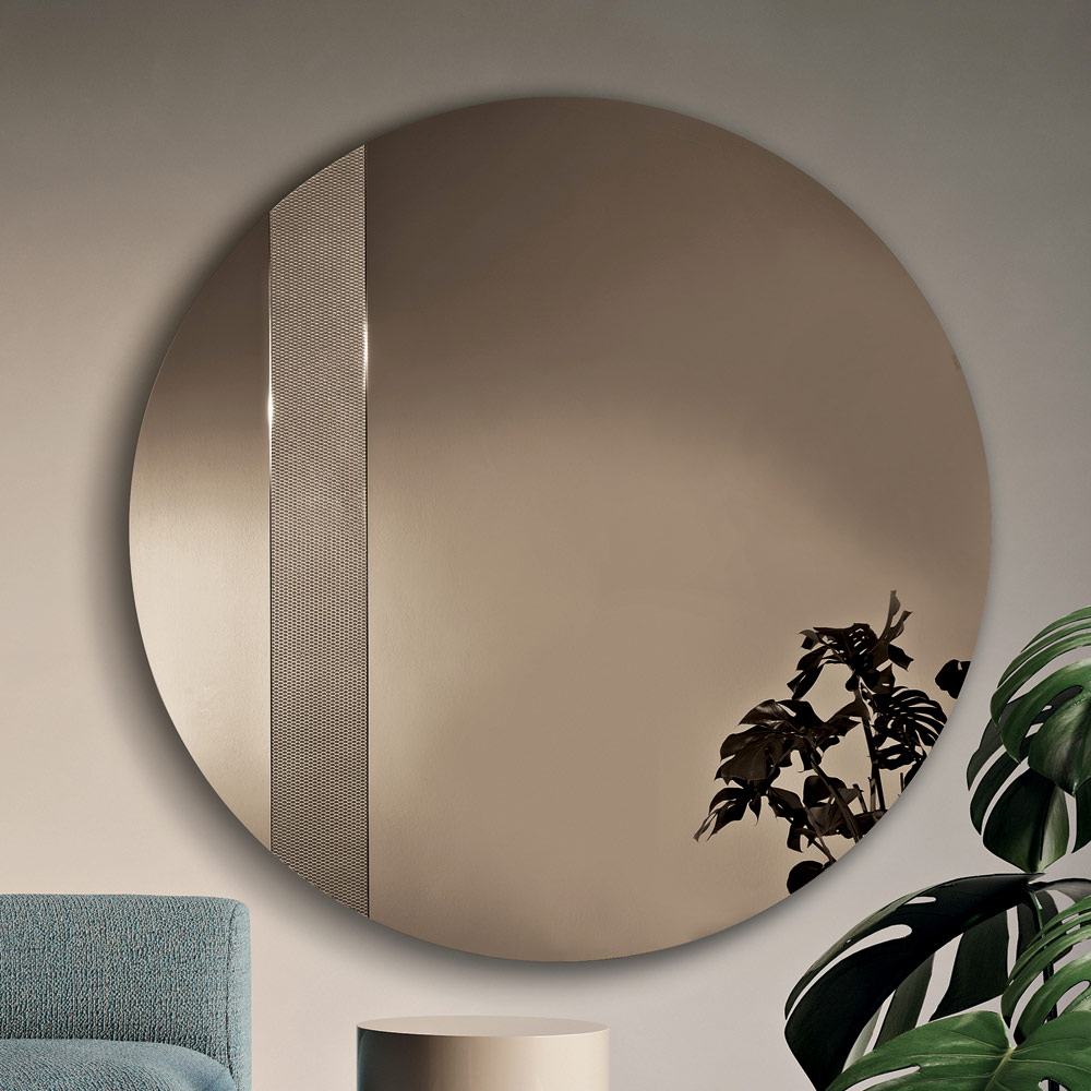 Oglinda are o formă rotundă , înfrumusețată cu un insert lateral din sticlă cu o plasă decorativă în nuanțe de ton . Acest detaliu grafic captează lumina și creează un joc elegant de reflexii, adăugând profunzime și mișcare suprafeței reflectorizante.