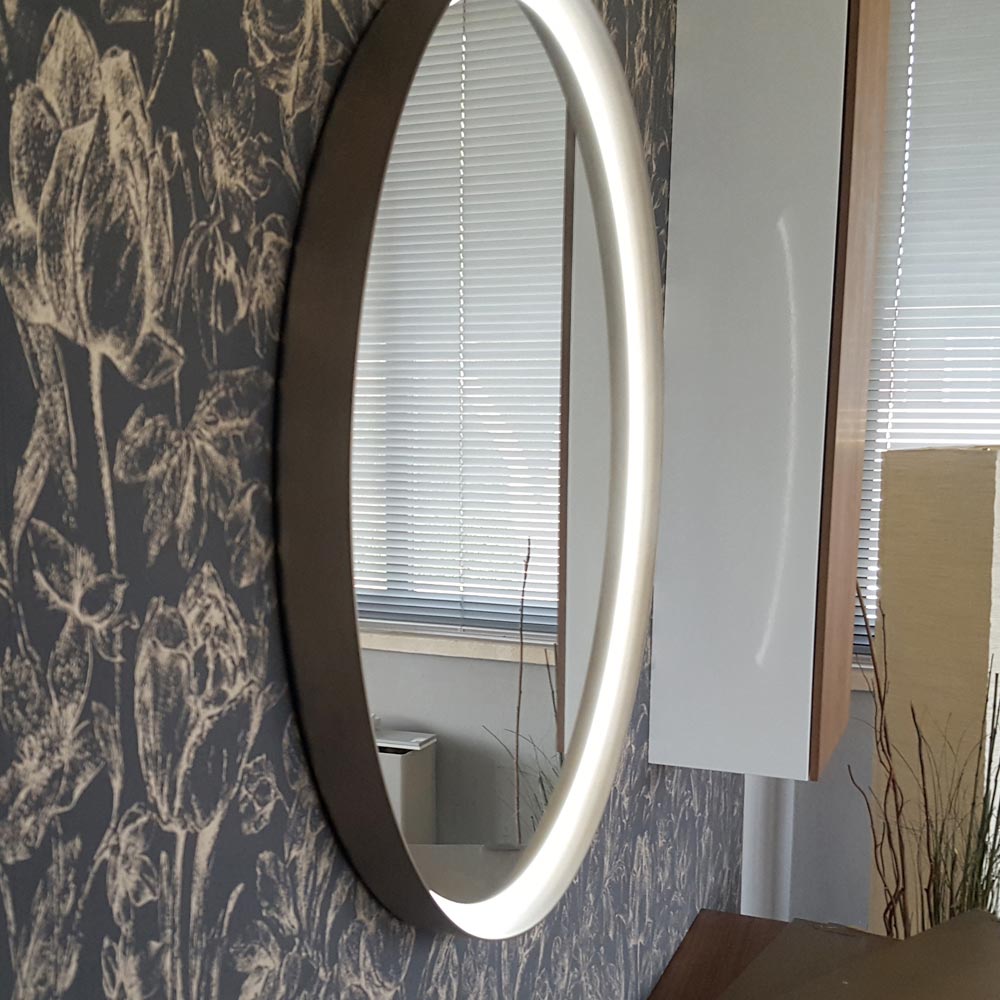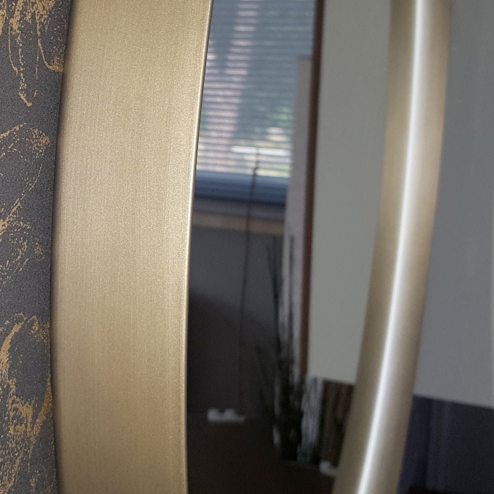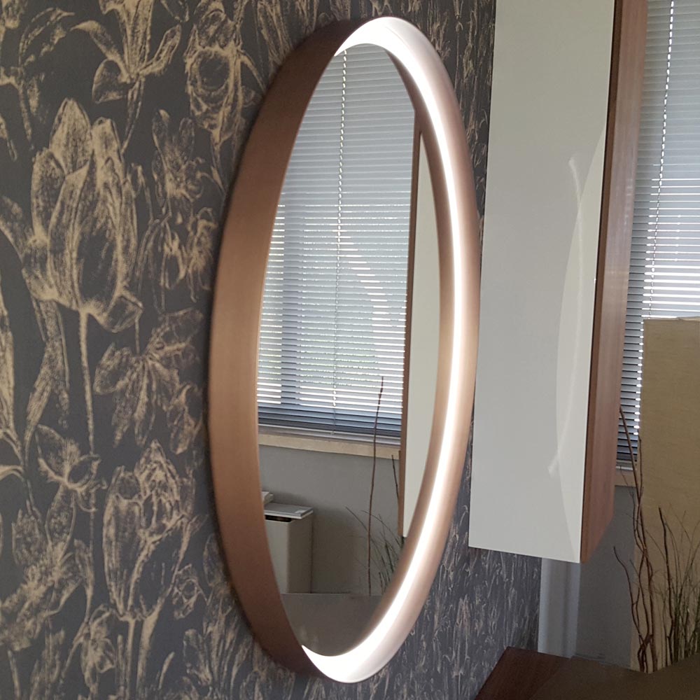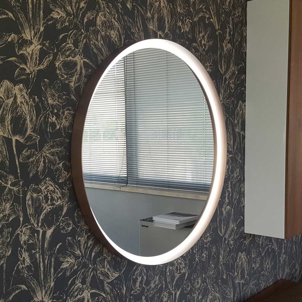 Oglindă rotundă de perete cu cadru metalic în 4 finisaje și lumină cu led, fabricată în Italia.