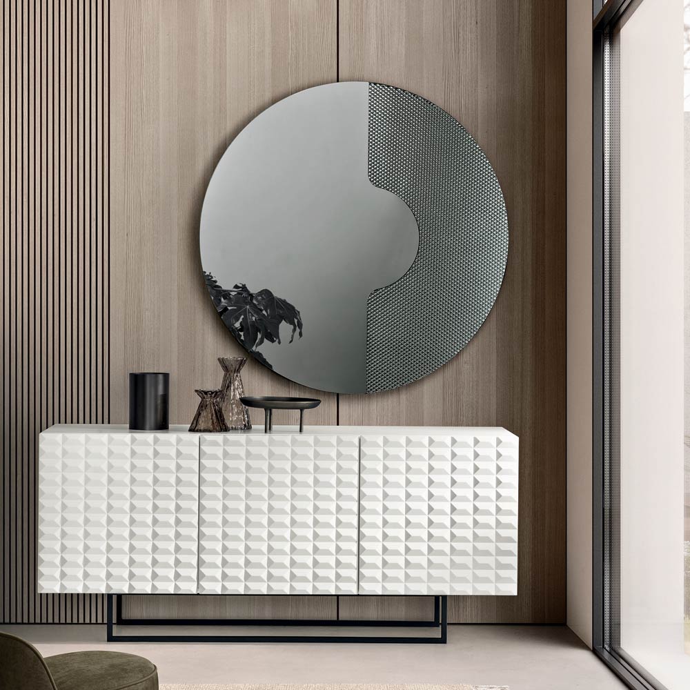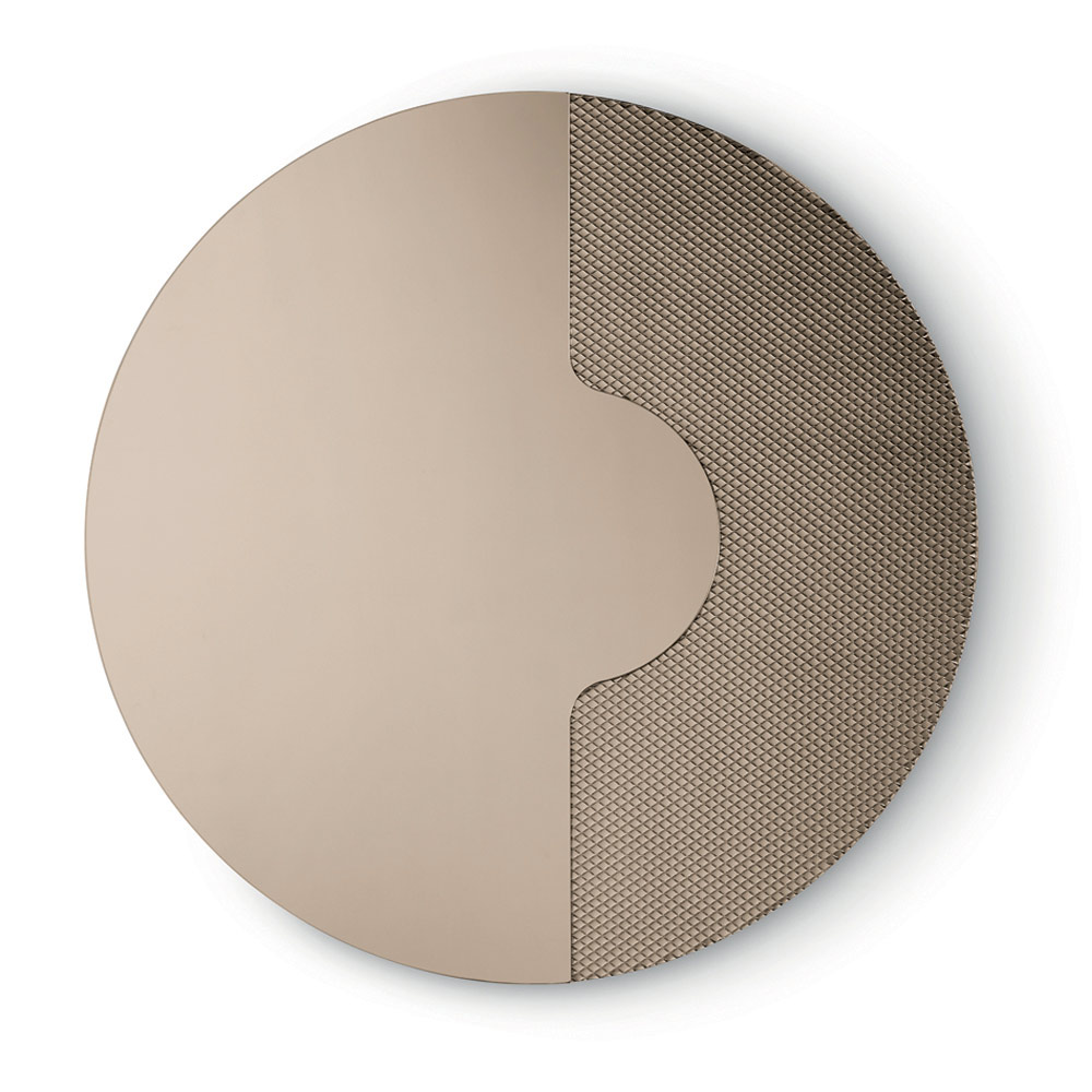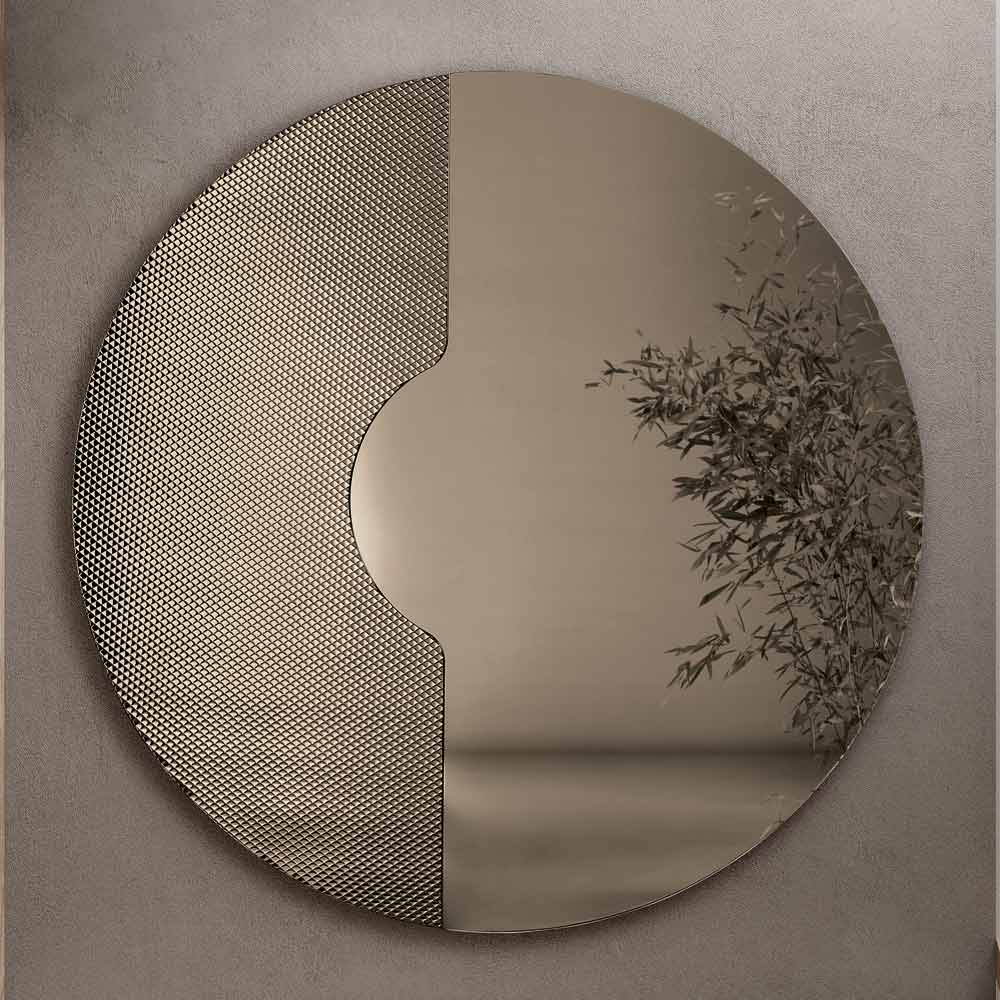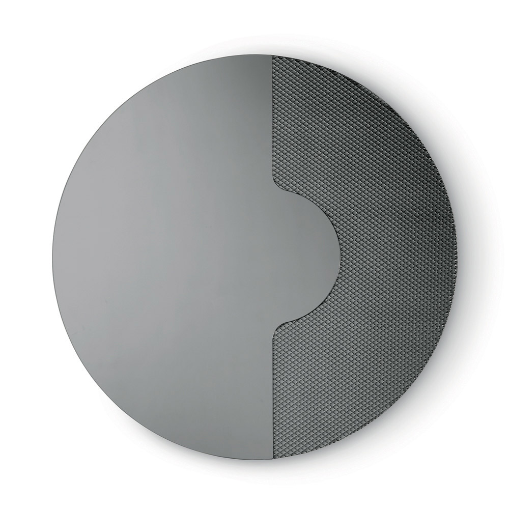 Oglinda rotundă prezintă o inserție laterală din sticlă ton pe ton, gravată cu un model grafic de plasă . Acest element decorativ susține panoul oglindit ca și cum s-ar sprijini pe el, creând un efect tridimensional rafinat și un joc elegant de grosimi și reflexii.
