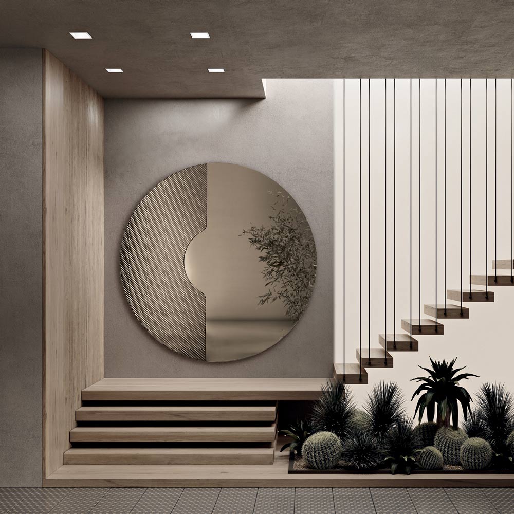 Datorită echilibrului său dintre geometrie și textură, această oglindă devine un element decorativ sofisticat, capabil să adauge profunzime și luminozitate peretelui, adaptându-se perfect mediilor moderne și contemporane.
