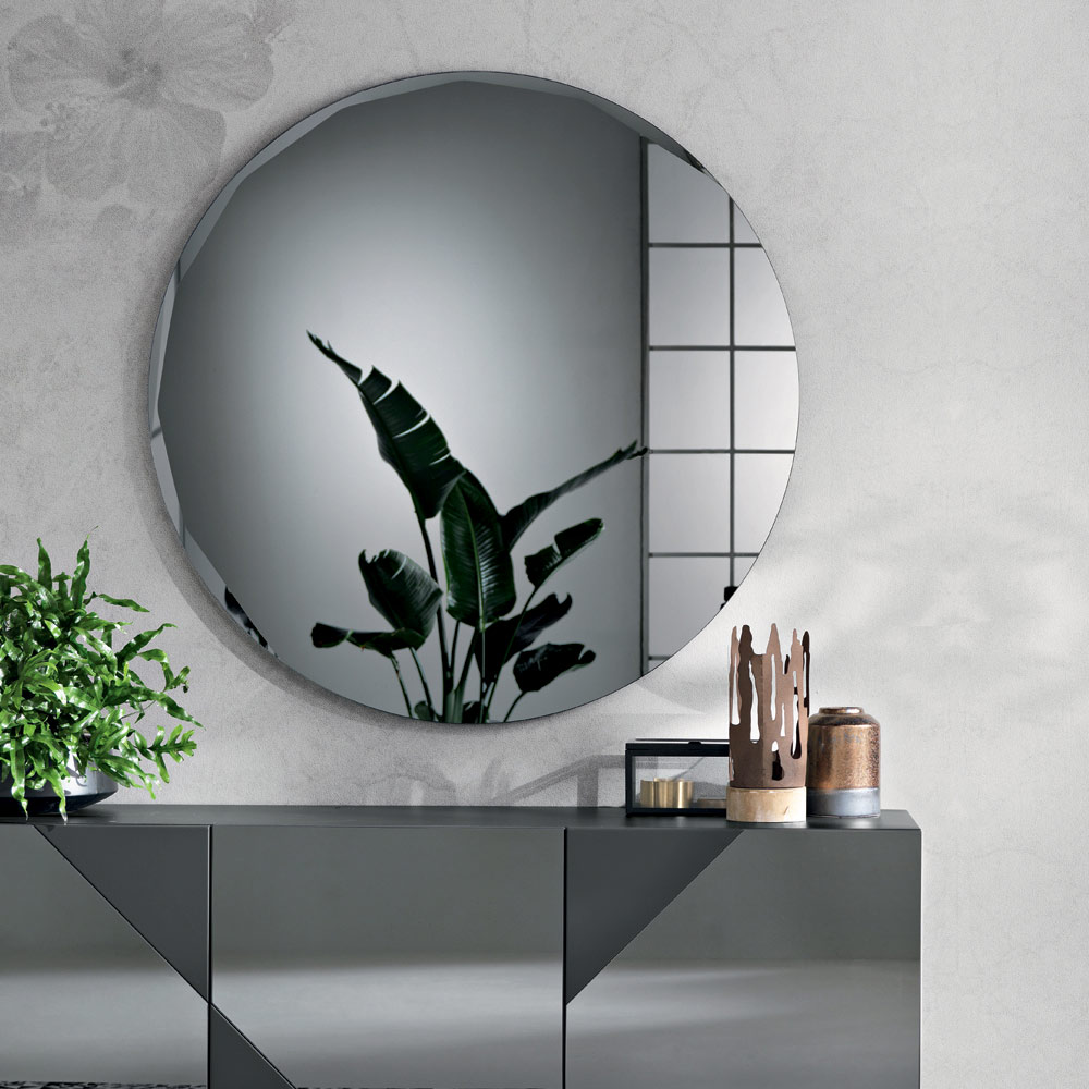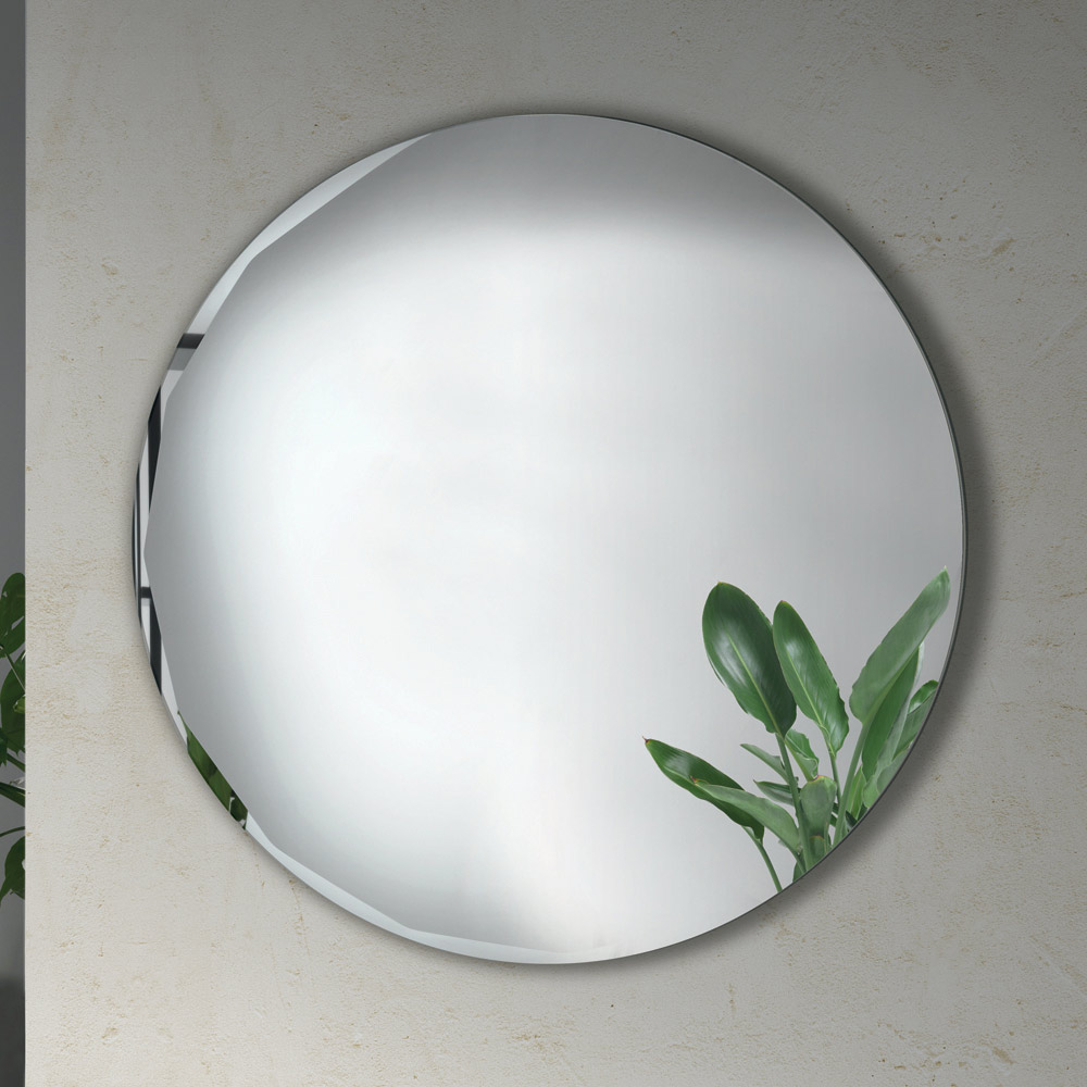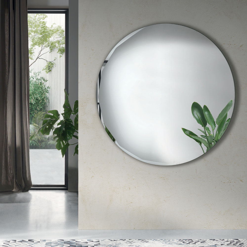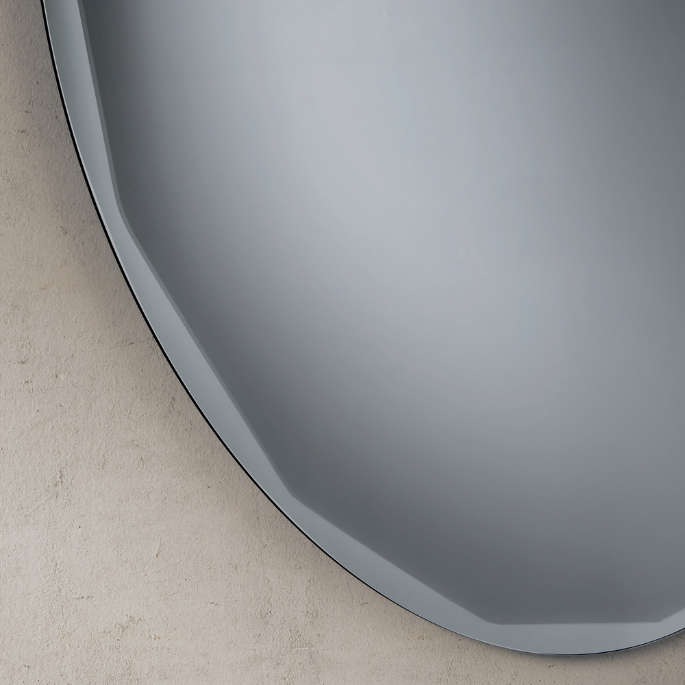 Oglinda are o formă rotundă pură, înfrumusețată cu o teșitură laterală rafinată care îi scoate în evidență profilul și accentuează designul minimalist. Acest detaliu creează un joc delicat de reflexii de-a lungul marginii, conferind profunzime și luminozitate suprafeței.