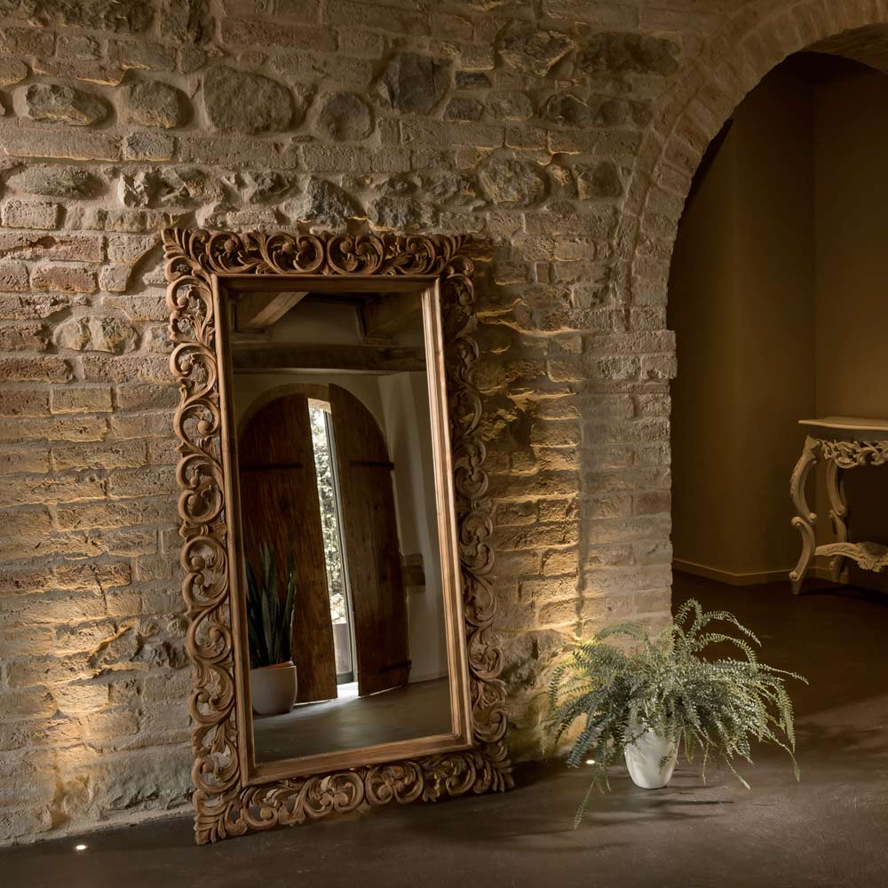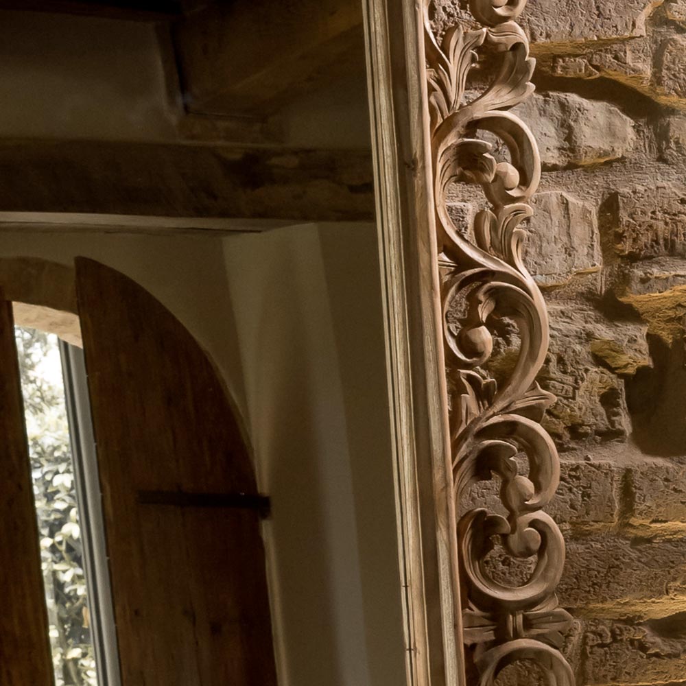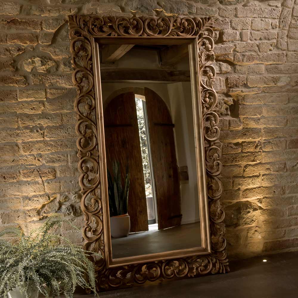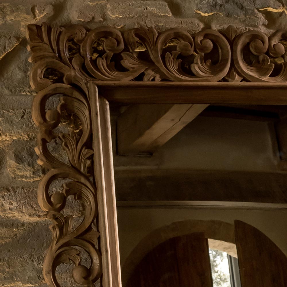Această oglindă din lemn masiv sculptat este un element decorativ fermecător, capabil să îmbunătățească orice spațiu cu eleganță și personalitate. Rama bogat lucrată, rezultat al măiestriei artizanale , conferă oglinzii un caracter unic și atemporal.