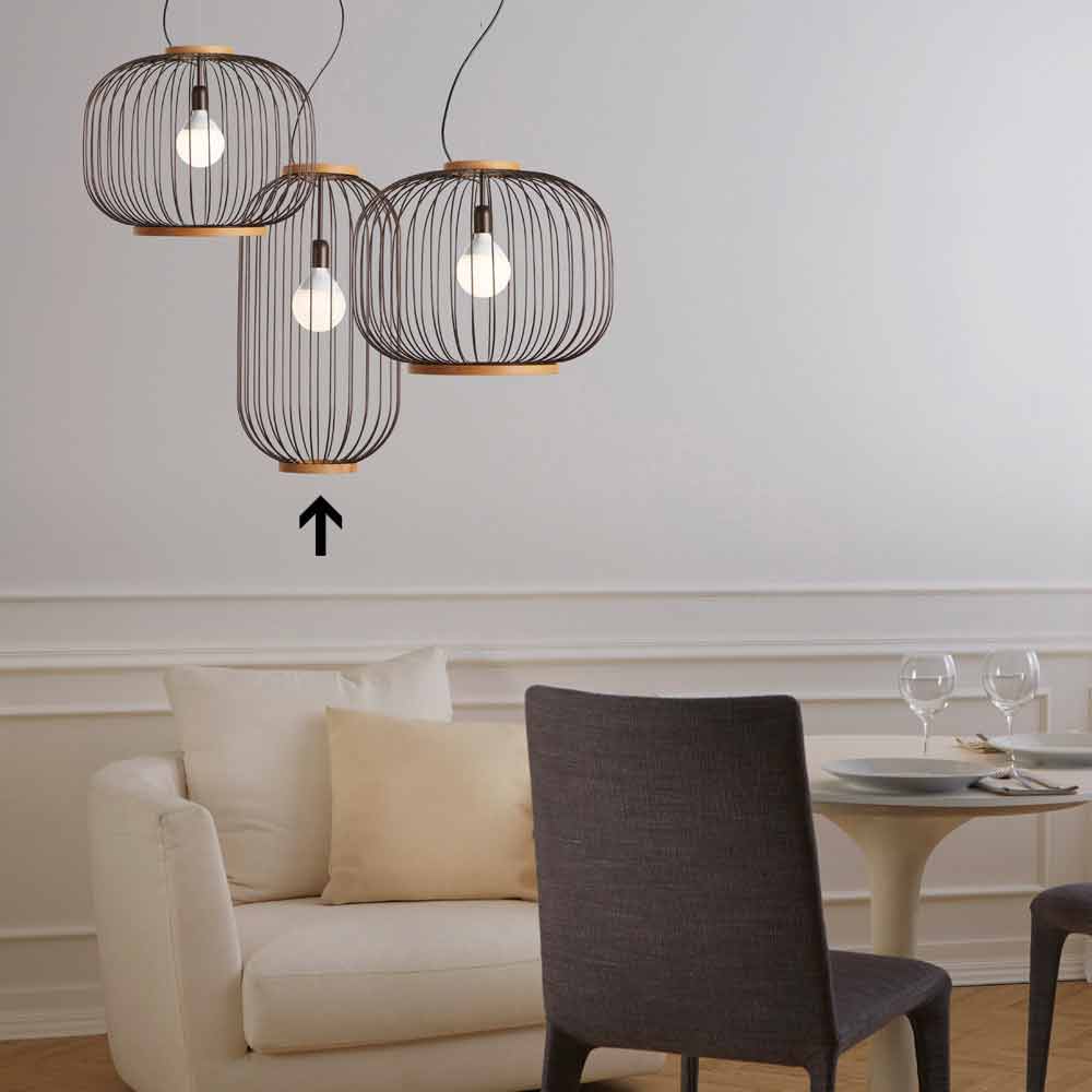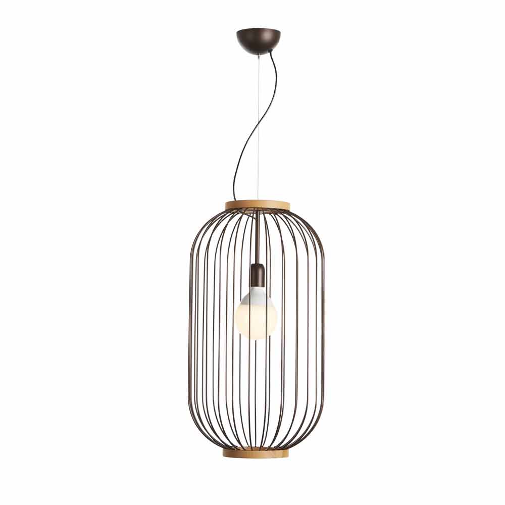 Lampa de suspensie din tija de oțel profilat și vopsit cu pulberi epoxidice. Cele două benzi care închid corpul sunt rotunjite din lemn natural.