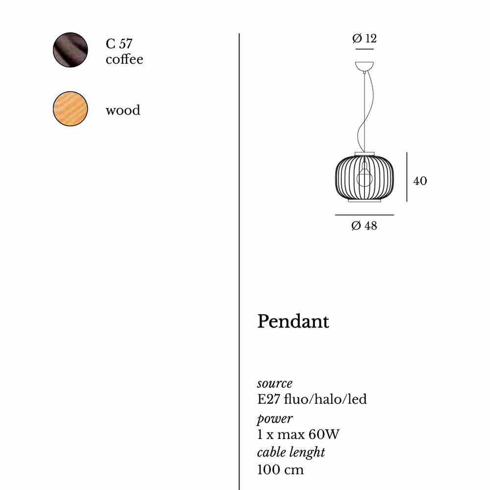 Lampa de suspensie din tija de oțel profilat și vopsit cu pulberi epoxidice. Cele două benzi care închid corpul sunt rotunjite din lemn natural.