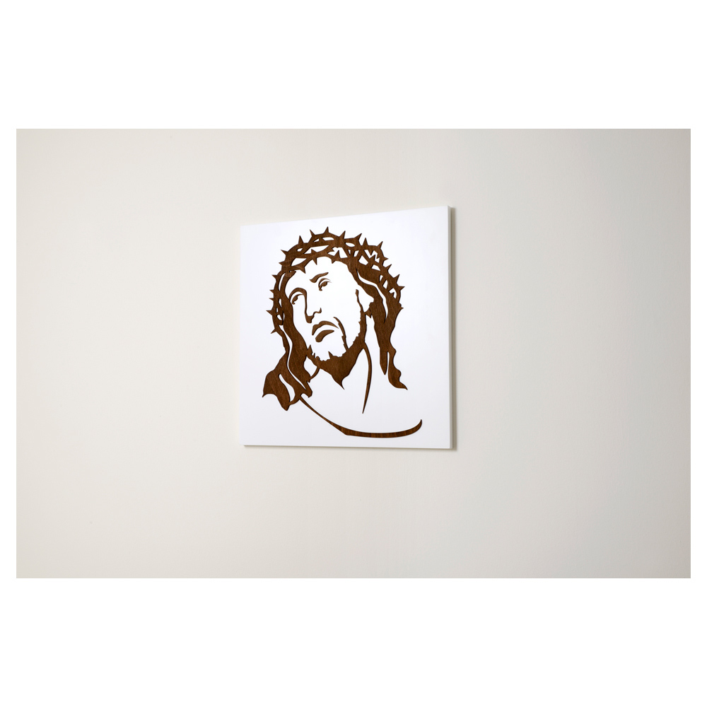 Cadru sacru din lemn lacuit alb cu aplicare a chipului lui Hristos din lemn wengé.