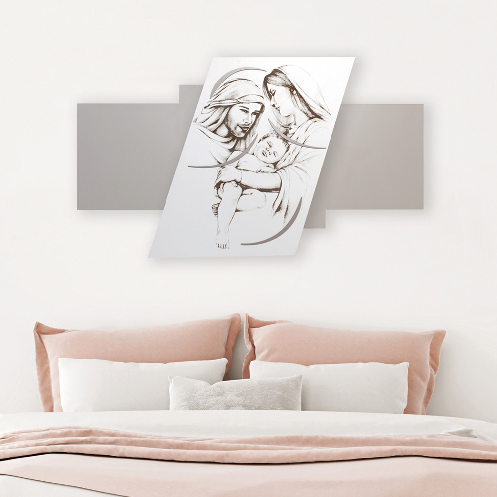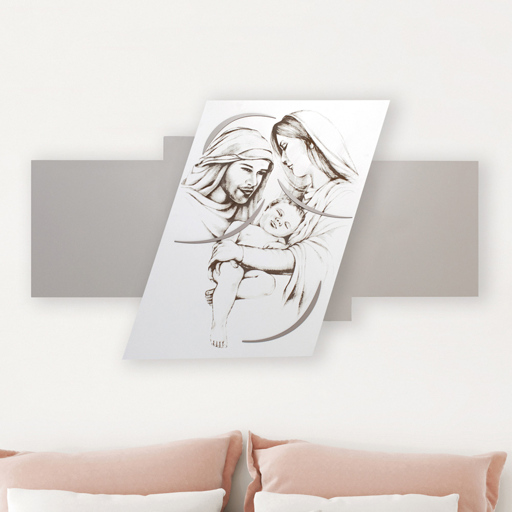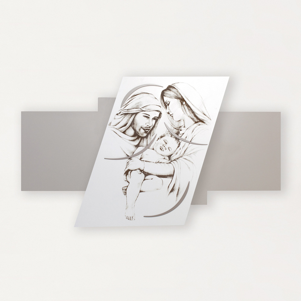 Reprezintă Sfânta Familie în marcaj cu laser, este o tăblie cu un design minimal perfectă pentru mediile moderne. Panou din lemn lacuit alb opac gravat cu laser pe un panou de culoare pietriș , cu decorațiuni din pietriș care înfățișează o scenă religioasă.