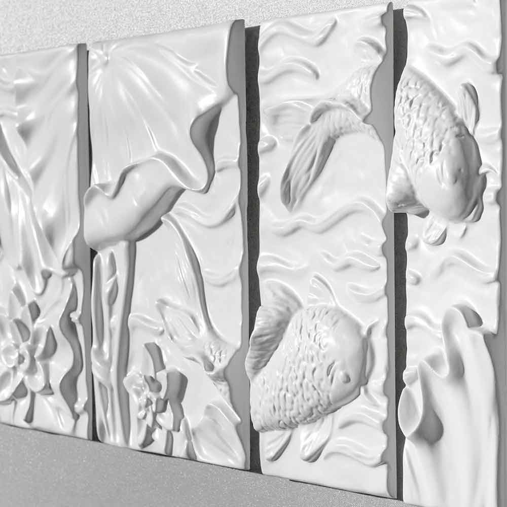 , din ceramică compozită, este compusă din patru elemente, cu linii elegante și forme moderne, în alb ivoriu, reprezentând crapul koi japonez, montat înclinat pe pânza lăcuită gri de mătase. Rezultatul este cu un impact estetic minim și decorativ, pentru un stil unic.