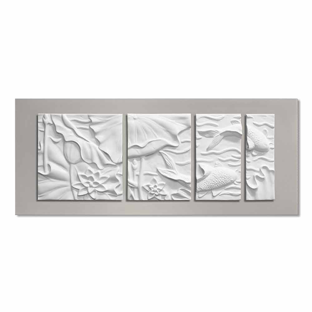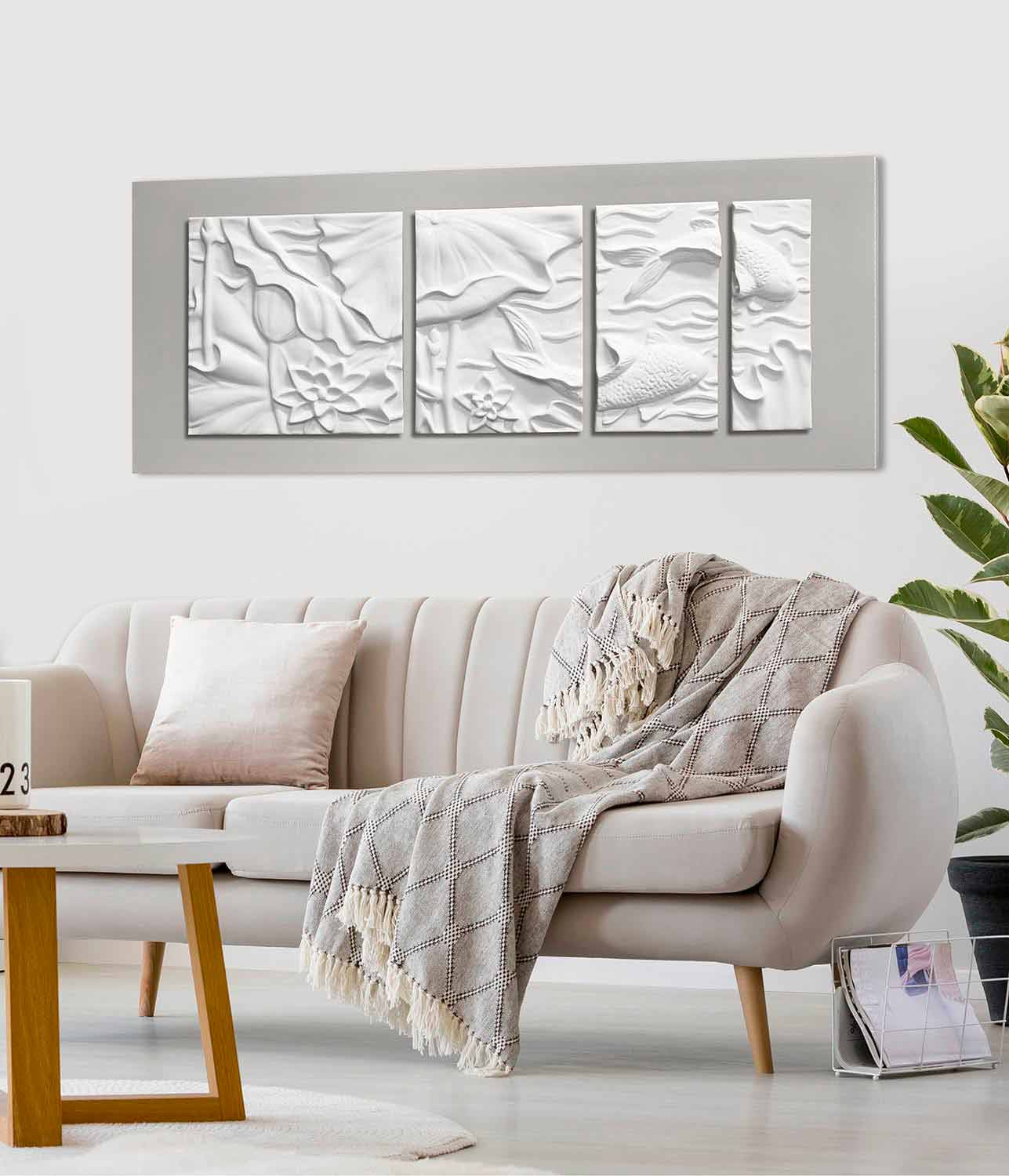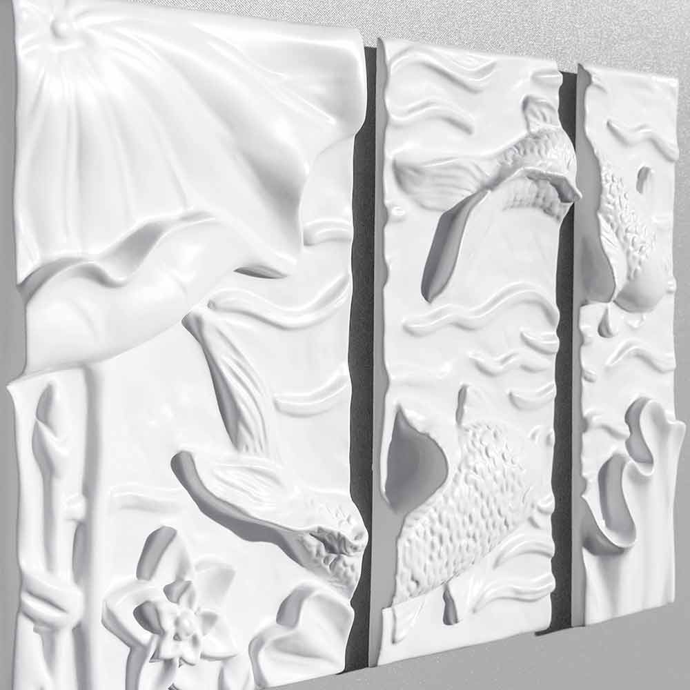 Decorarea pereților design modern în basorelief din ceramică alb ivoriu pe pânză lăcuită gri de mătase, realizată în Italia.