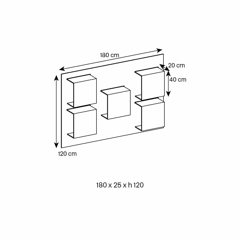Realizat cu un panou din lemn finisat cu nuc canaletto cu 5 rafturi din sticlă transparentă , este disponibil în versiunea orizontală sau verticală.