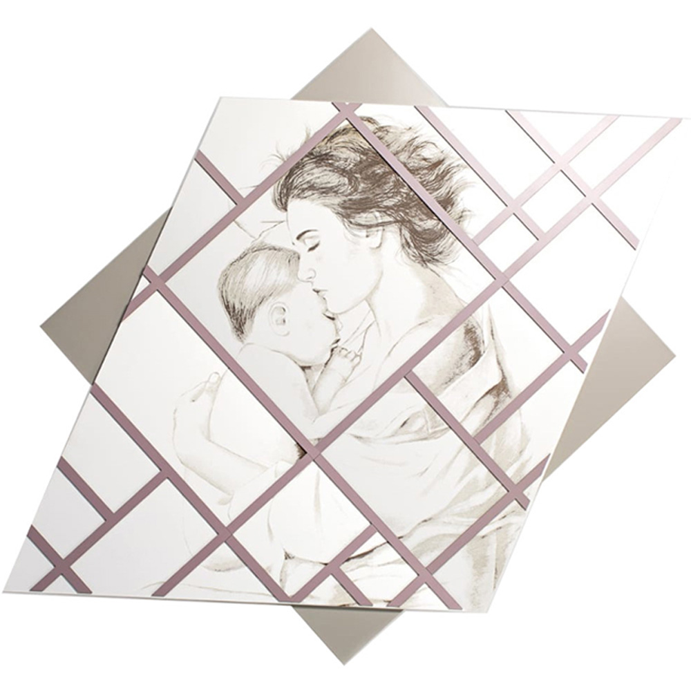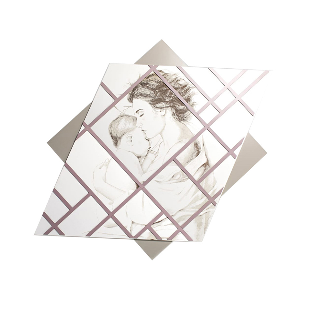 O tăblie înfățișând maternitatea cu o îmbrățișare între mamă și copil datorită marcajului cu laser, care arată trăsăturile fețelor. Panou din lemn lacuit alb mat cu marcare cu laser, o tehnica speciala care creeaza un basorelief pe materiale. Panoul este gravat pe un panou de culoare pietriș și este decorat în catifea sau roz cacao la alegere.