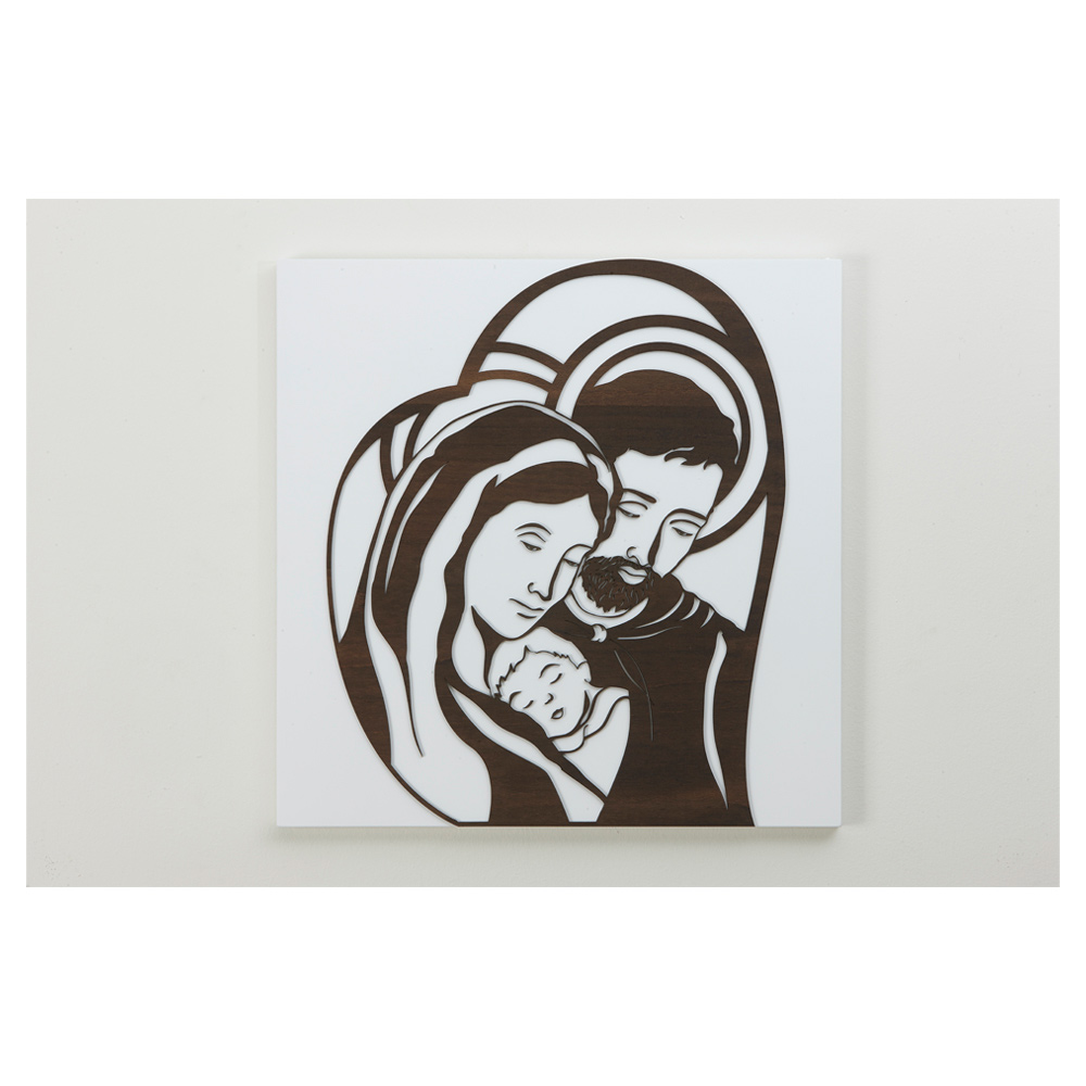 Cadru sacru din lemn lacuit alb cu aplicarea fetelor Sfintei Familii din lemn wengé.