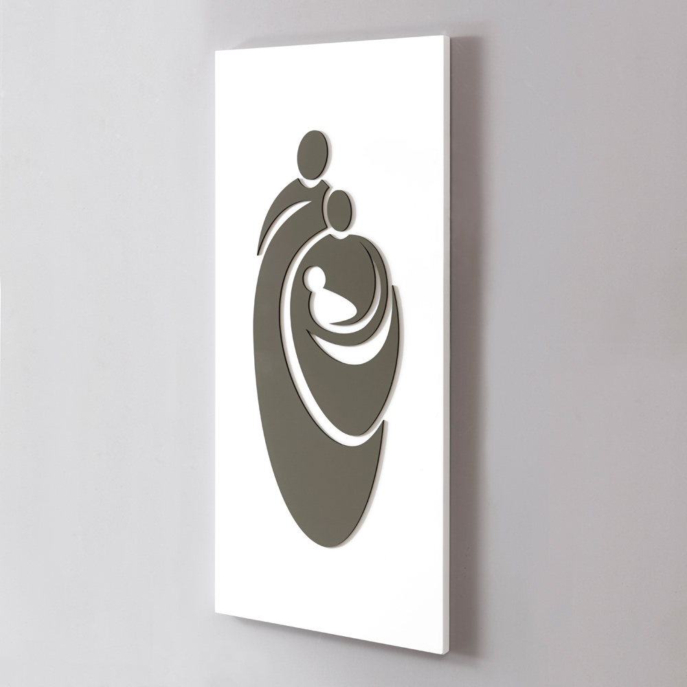Cadru sacru din lemn lacuit alb cu aplicare din lemn lacuit gri porumbel stilizata Sfintei Familii .