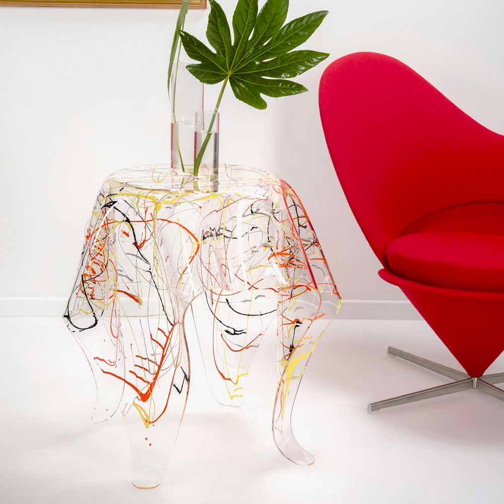 Tabla Otto este o piesă unică, o lucrare de artă modernă. O foaie de polimer 100% pură din plexiglas PMMA pură, cu pulverizare de vopsea, drapată manual la temperaturi ridicate, pentru a crea o masă unică și nereproductivă.