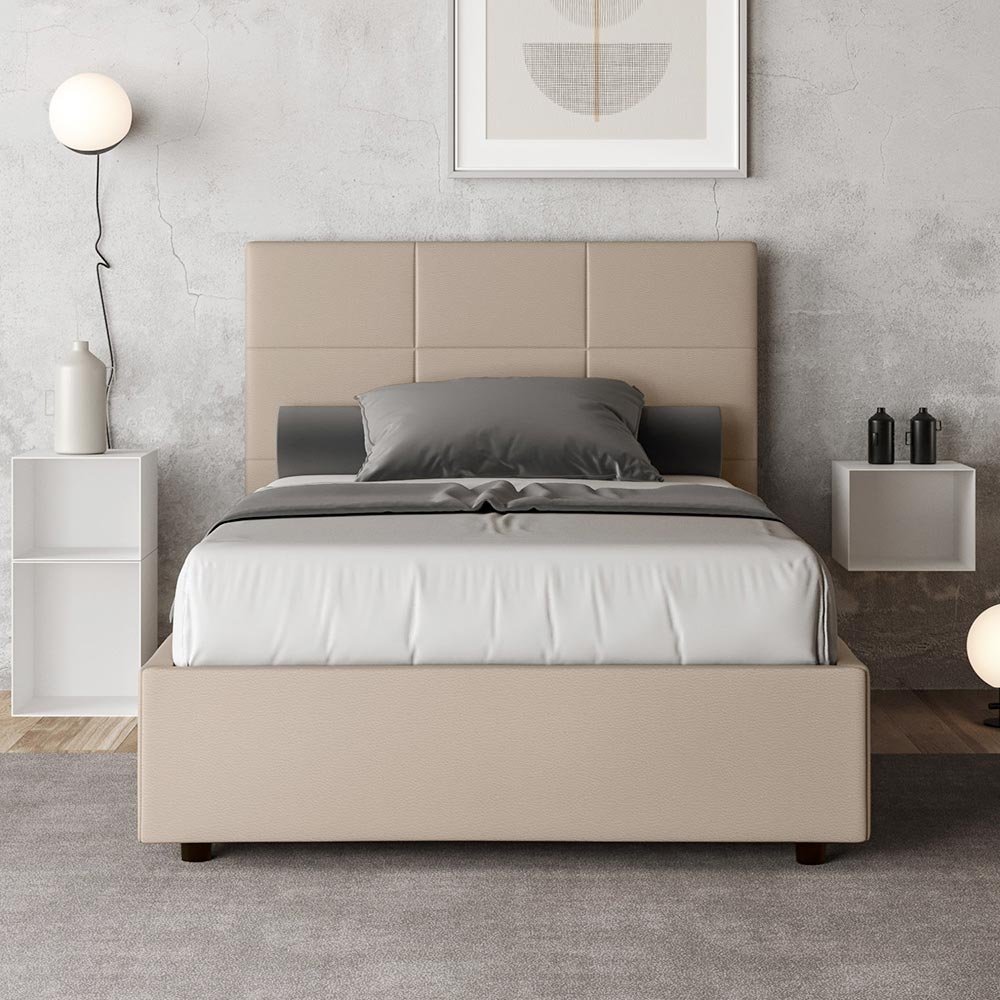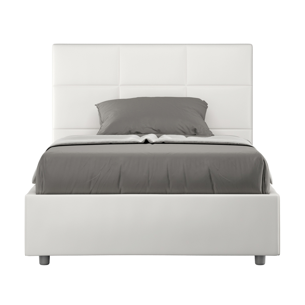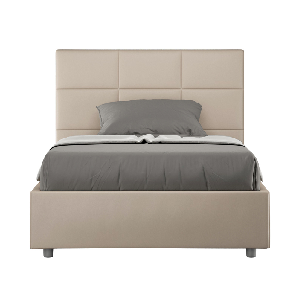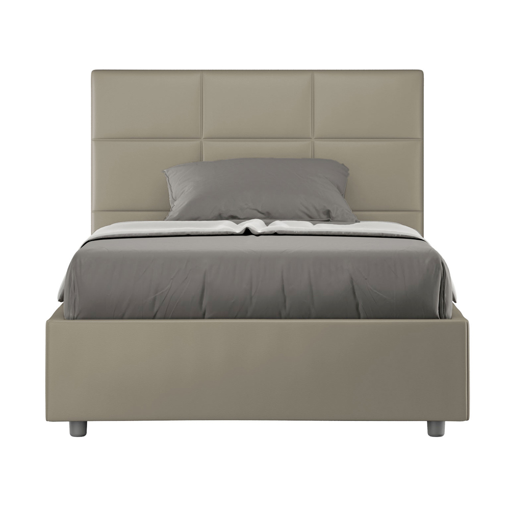 Pat queen-size căptușit, 120x200 cm, realizat din panouri din PAL și acoperit cu imitație de piele , fabricat în întregime în Italia. Acest pat, cu cadrul său căptușit, este exemplul perfect al modului în care eleganța și confortul pot fi combinate într-o singură piesă de mobilier. Acest model se caracterizează prinTăblie îmbogățită cu modele geometrice dreptunghiulare . Tapițată cu piele ecologică, este ușor de curățat: o singură lavetă din microfibră este suficientă pentru o curățare rapidă și eficientă.