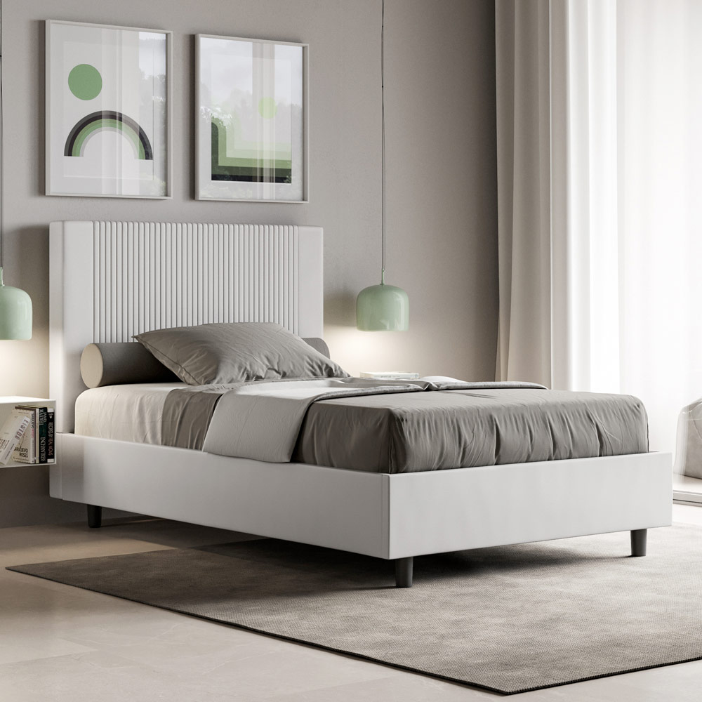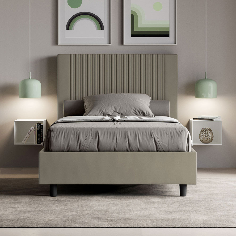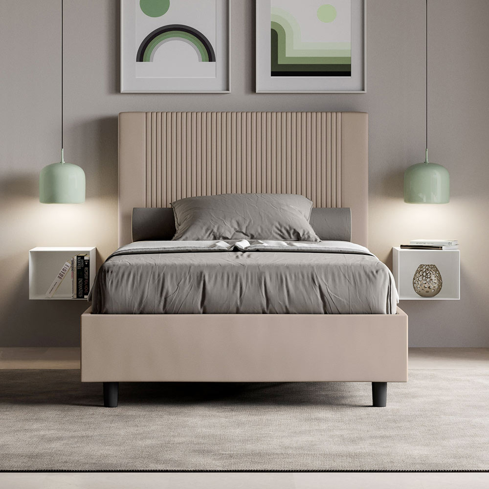Pat francez 140x200 cm căptușit cu panouri melaminate și acoperit cu imitație de piele , fabricat în întregime în Italia. Acest pat franțuzesc, cu cadrul său căptușit, este un produs de fabricație italiană din piele ecologică. Designul său simplu, dar modern, este perfect pentru spațiile care se disting printr-o eleganță sofisticată. Caracteristica principală a acestui model este tăblia sa, împodobită cu un motiv de linii verticale , ideală pentru cei care doresc să o combine cu spații atrăgătoare din punct de vedere vizual, cu pereți proeminenți, menținând în același timp o eleganță inconfundabilă.