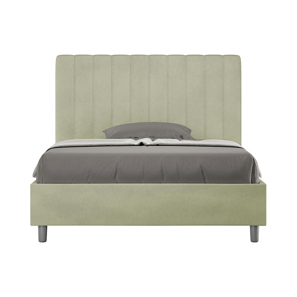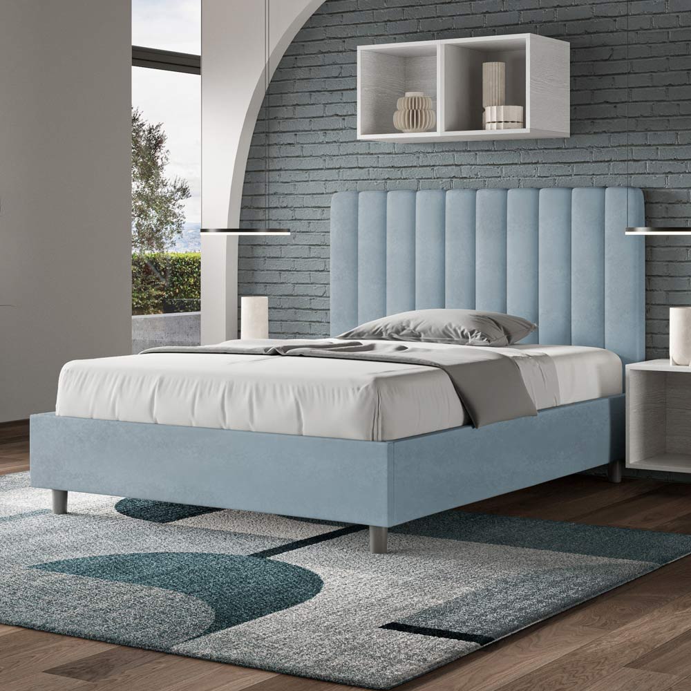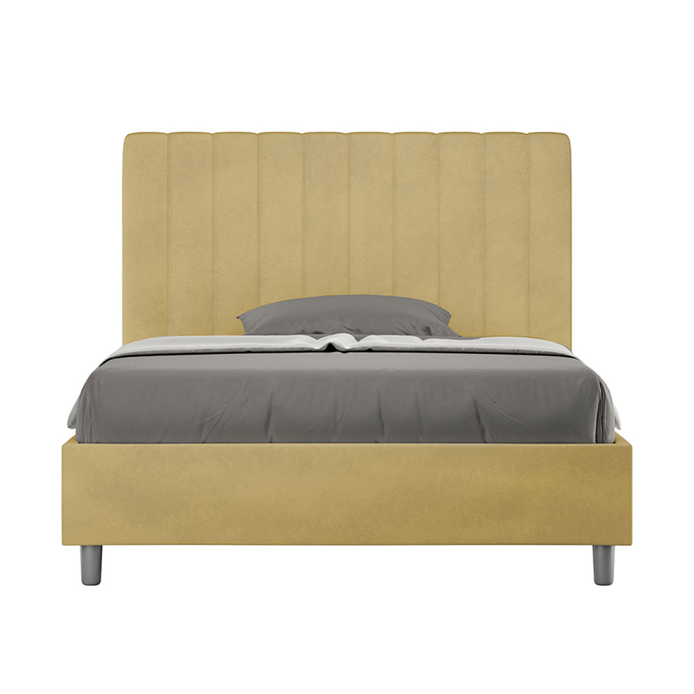 Pat queen-size căptușit, 120x200 cm, realizat din panouri din PAL și acoperit cu microfibră , fabricat în întregime în Italia. Acest pat queen-size cu cadru tapițat este ideal pentru cei care caută o piesă decorativă deosebită, fără a fi excesiv de îngrădită. Patul se mândrește cu o tăblie minimalistă, cu un efect delicat matlasat, cu linii verticale simetrice , care se potrivește perfect în orice decor, fie el modern sau clasic.