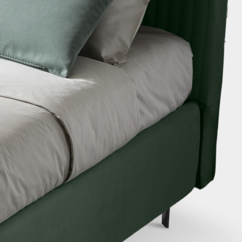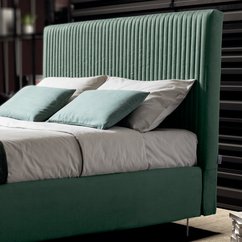Pat dublu cu bază dinamică , cutie de depozitare,picioare metalice cu finisaj din oțel lustruit (înălțime 12 cm) și tăblie groasă din țesătură hipoalergenică, rezistentă la pete, respirabilă, care nu se contractă , realizată printr-un proces special de matlasare cu benzi înguste și verticală multiple. linii care scot în evidență linia sa modernă și originală. Acest pat este simbolul confortului și al designului contemporan. Este o combinație perfectă de rafinament și funcționalitate , concepută pentru a oferi nopți de relaxare pură și stil de neegalat.