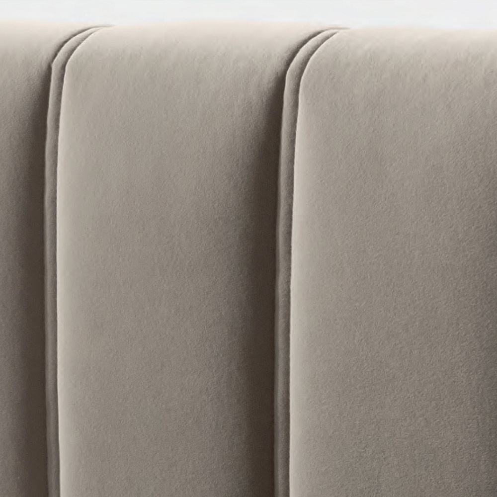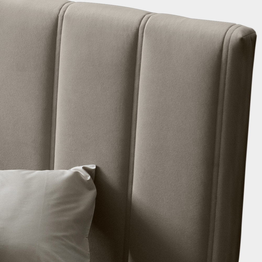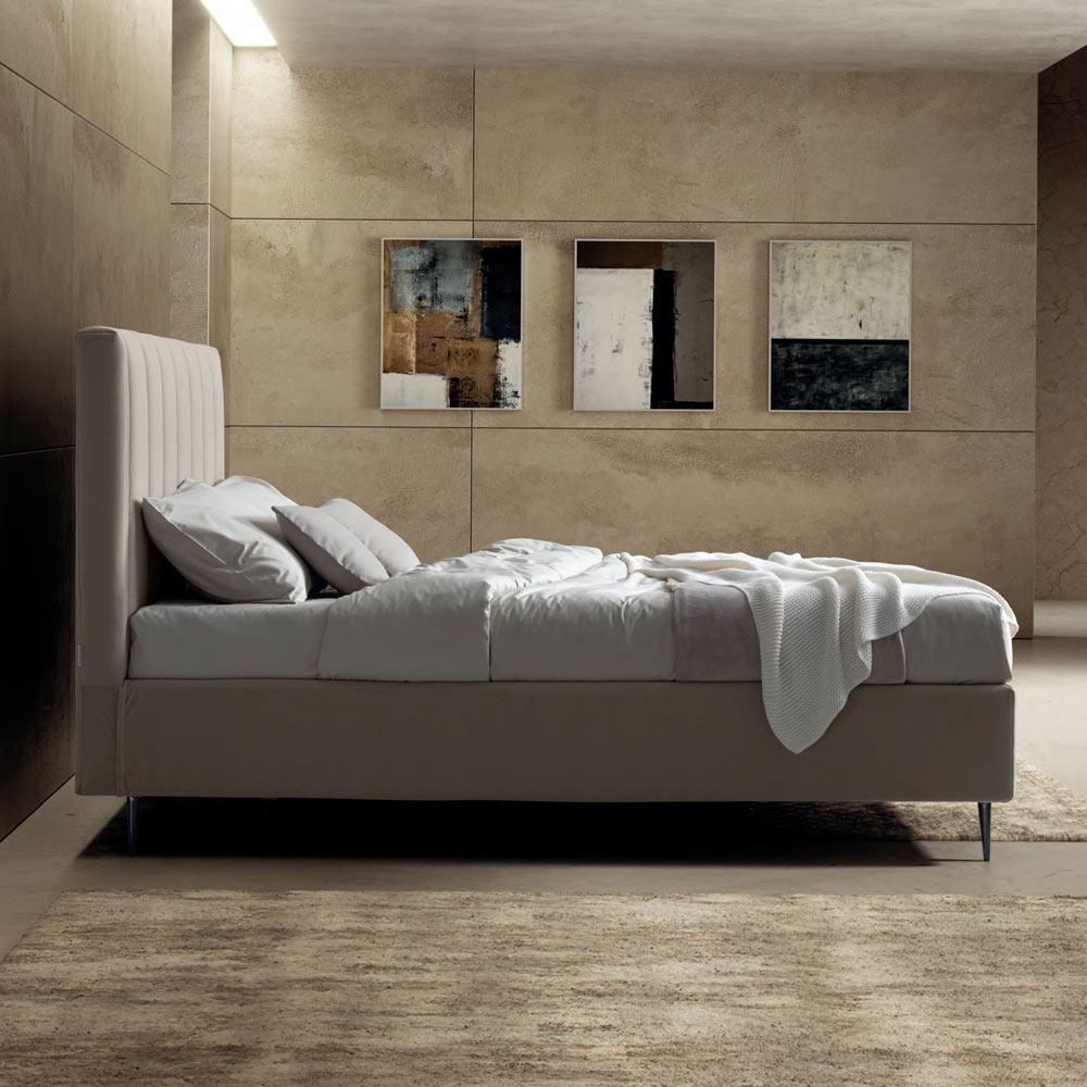 metalice cu finisaj moka (inaltime 15 cm) si tablie de pat groasa din material ignifug, realizata printr-un procedeu special de matlasare cu benzi verticale late care evidentiaza rigoarea si liniile curate.
