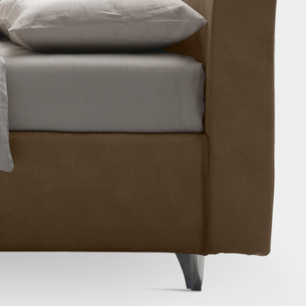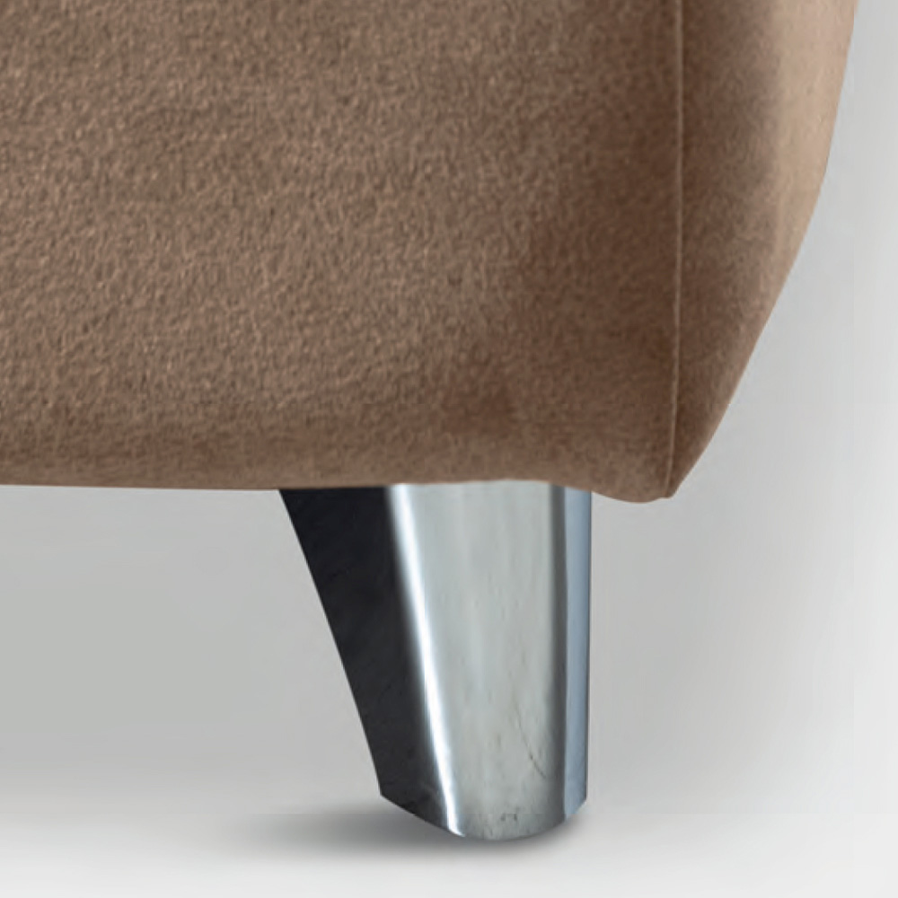 cutie de depozitare, picioare metalice cu finisaj din otel lustruit (inaltime 10 cm) si tablie curbata de grosime considerabila care face din patul protagonistul unor medii spatioase si rafinate. Manopera, caracterizata prin cusaturi in relief si contrastante in centrul tabliei, ofera o nota de croitorie produsului din material rezistent la pete.