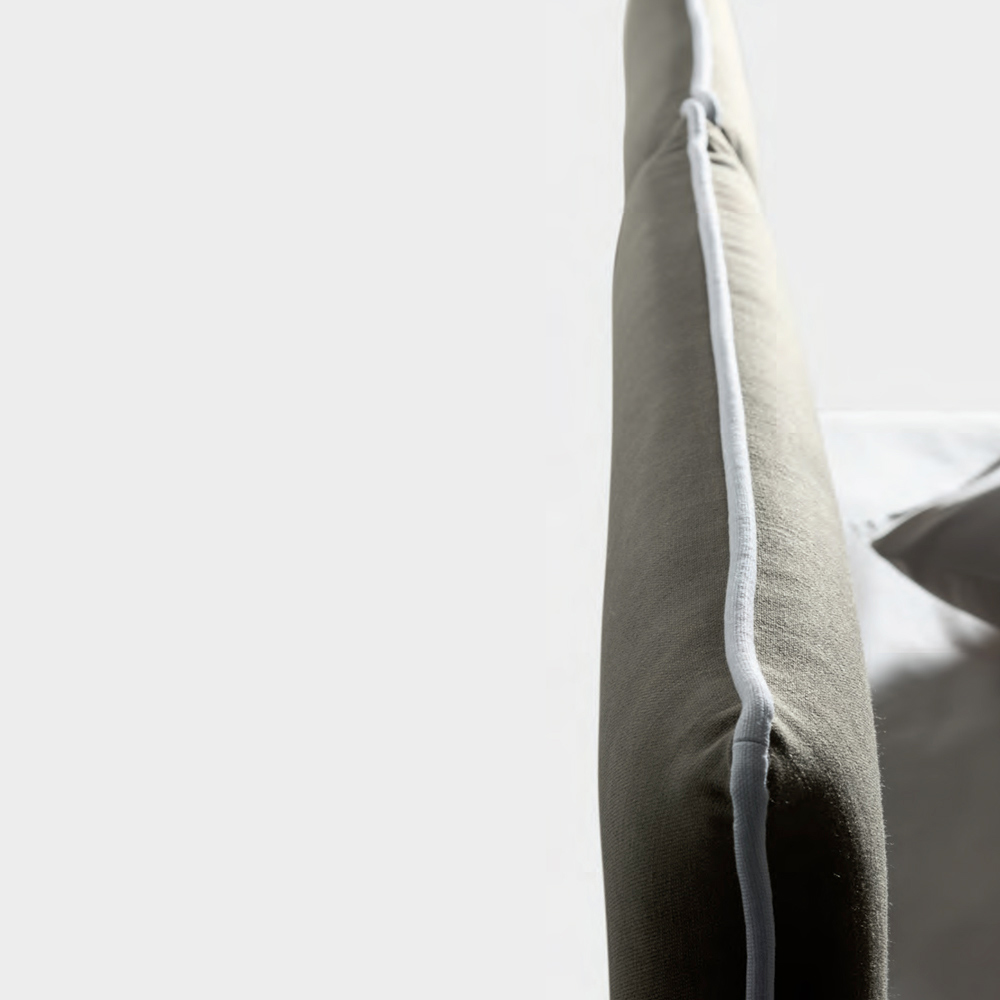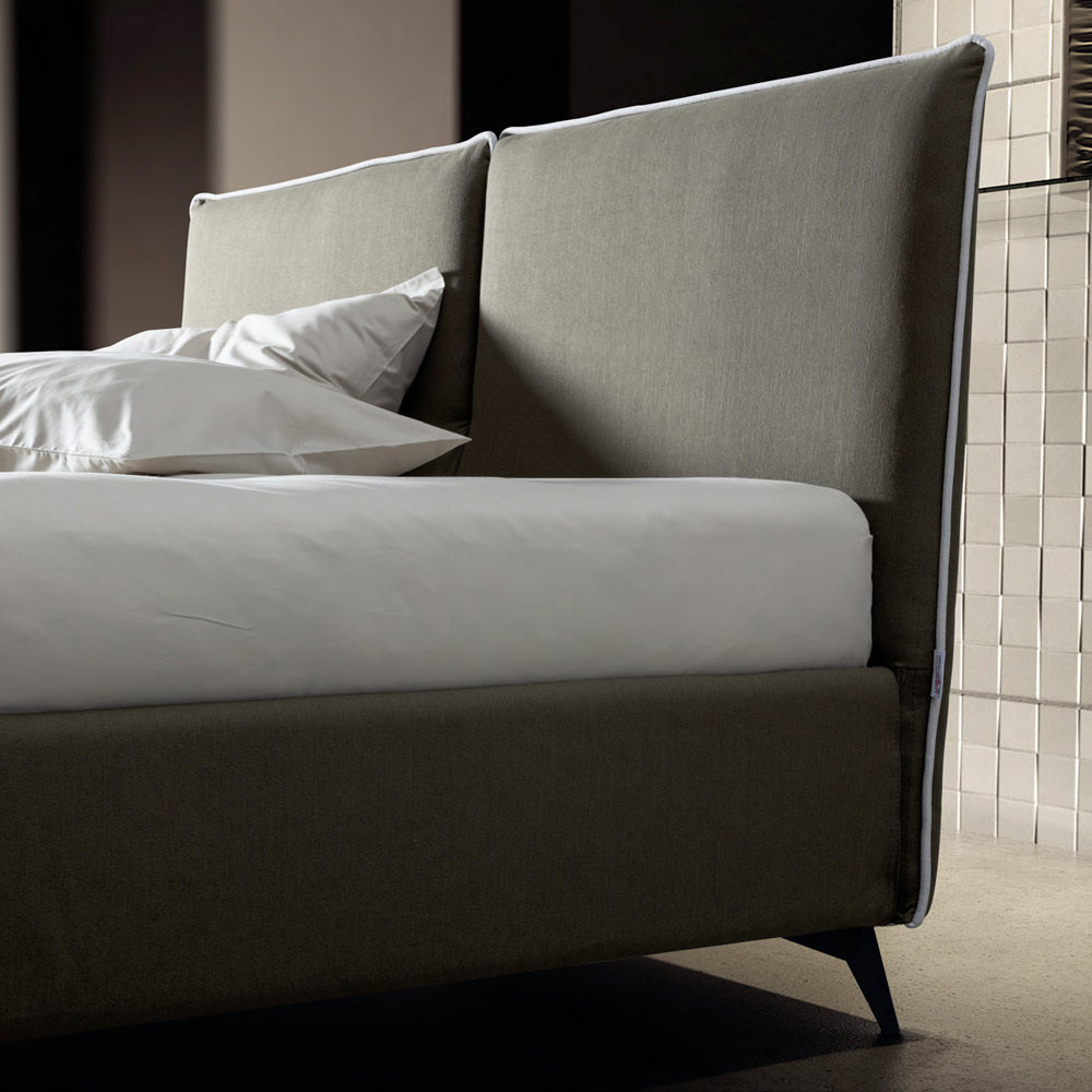 material hidrofug ; tăblia patului, împărțită central și caracterizată prin finisajul deosebit cu șnur contrastant, conferă acestui model o imagine captivantă și unică.