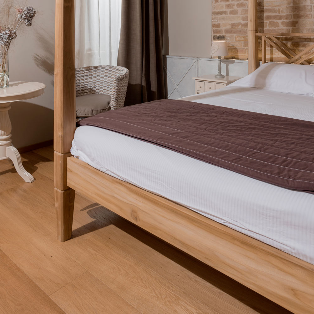 Liniile esențiale ale baldachinului fac ca acest pat să fie perfect atât pentru decoruri clasice, cât și pentru cele mai contemporane, oferind o prezență dramatică fără a sacrifica echilibrul estetic.