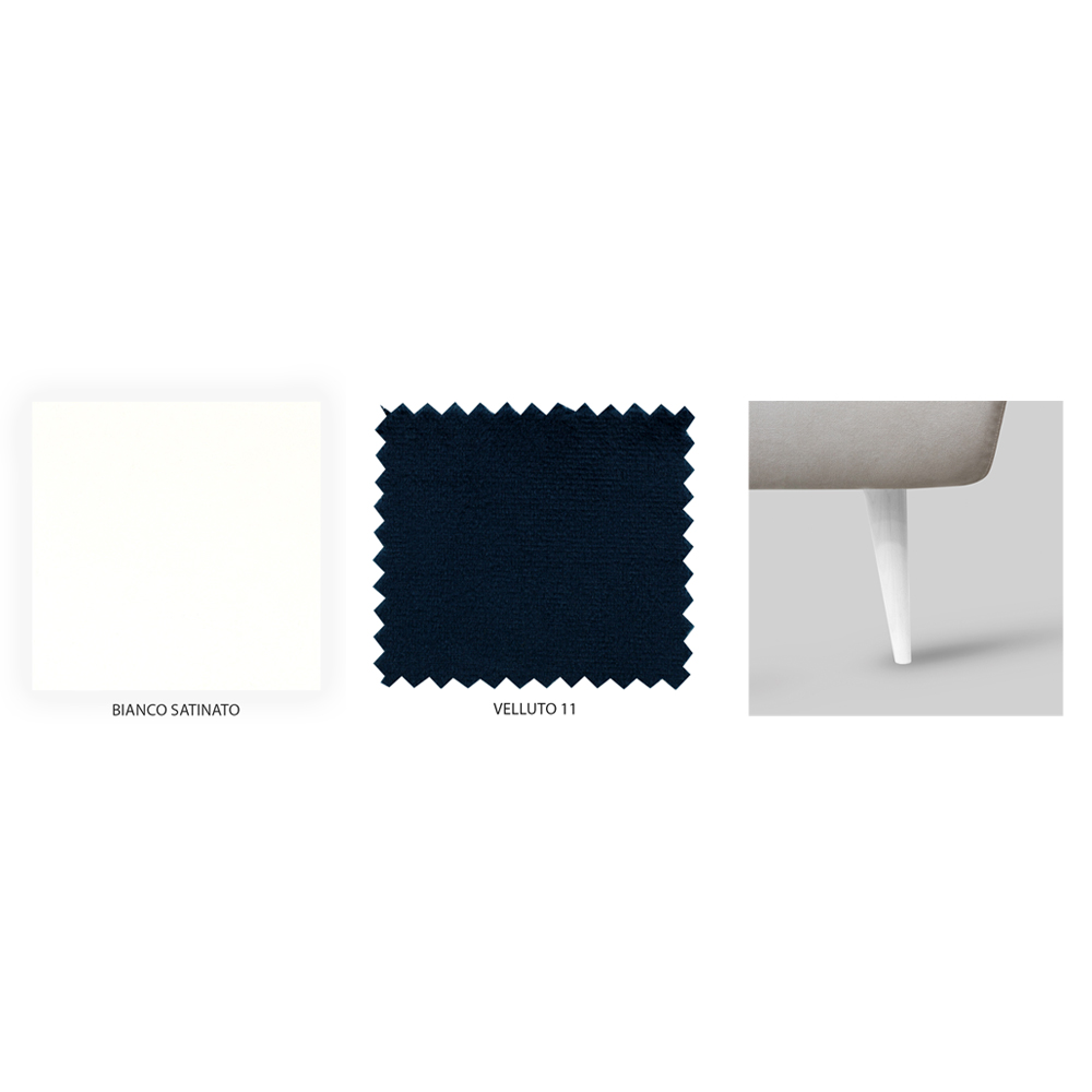 - Model H 25 picioare: tăblie alb satinat, cadru de pat din catifea gri/albastru 11 și picioare din lemn alb