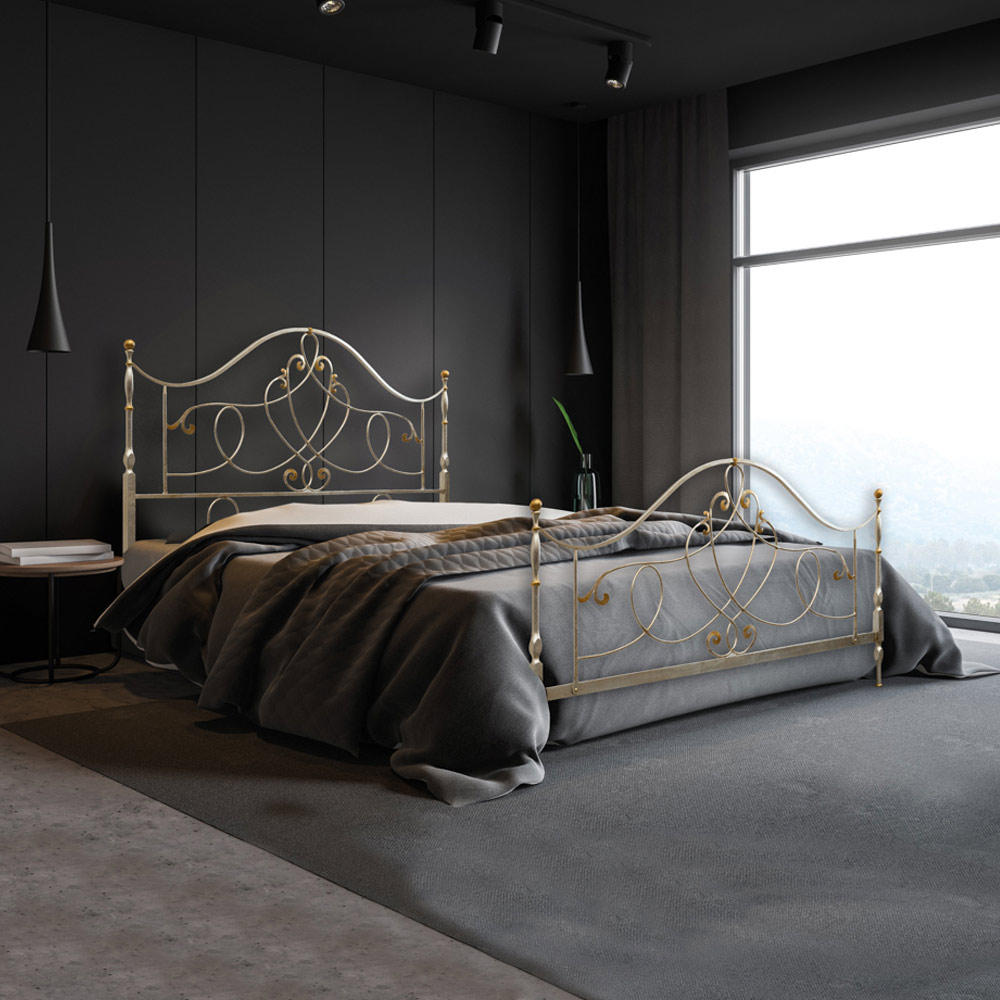 vopsea pulbere sau vopsire manuală în frunze. Cu acest pat dorim sa aducem un omagiu traditiei prin crearea unui echilibru perfect intre inovatie si modele clasice prin combinarea finisajelor si culorilor elegante si rafinate. În zona de dormit se creează o atmosferă de altădată care întâmpină și răsfață persoana.