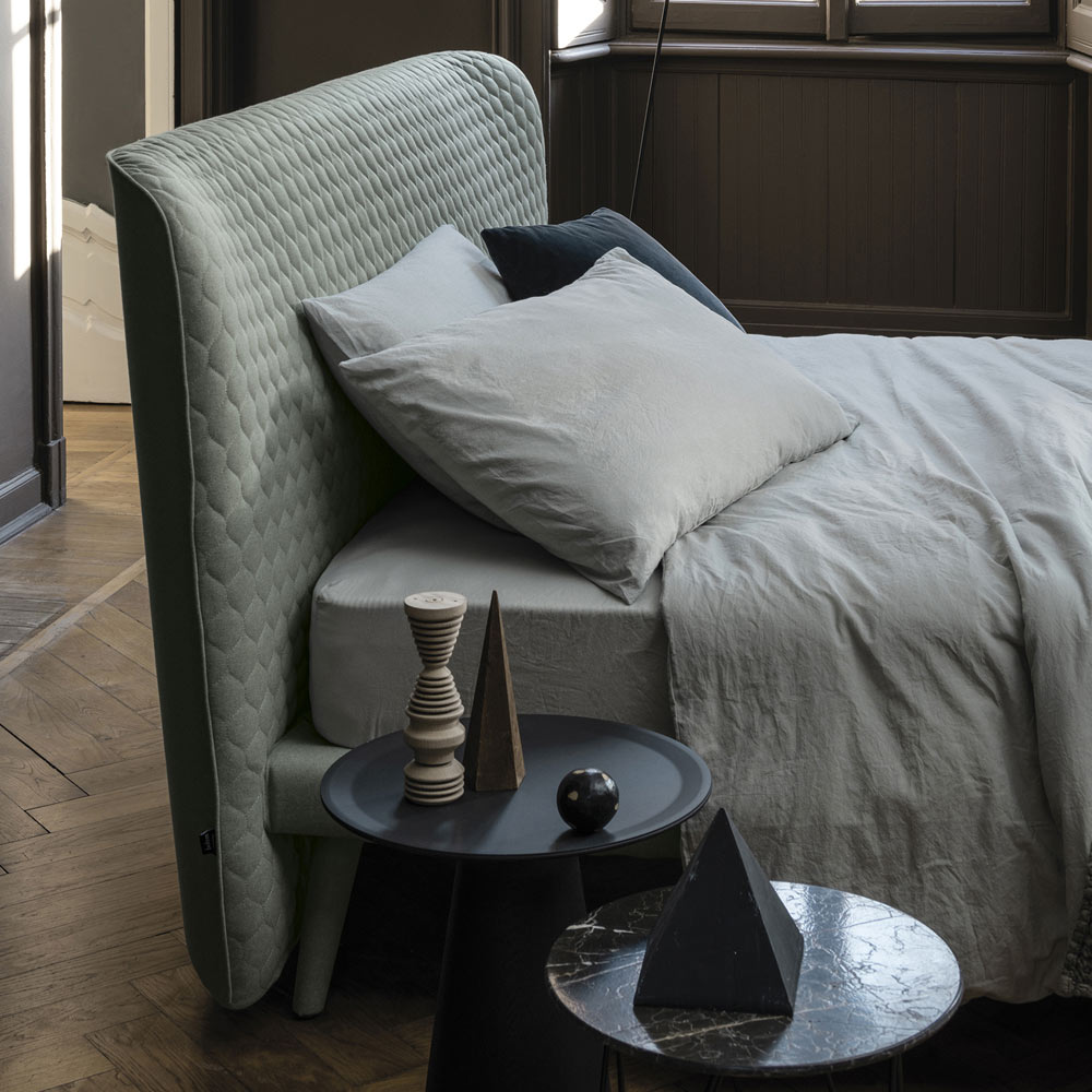 Patul dublu Corolle cu design contemporan are o linie sinuoasă împletită cu o alegere cromatică precisă. Linii moi, pe care le găsim și în textura tăbliei.