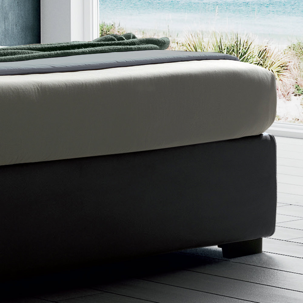 Pat dublu de design Made in Italy, cu cutie de depozitare, imbracat in stofa.