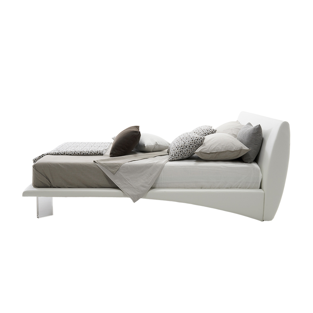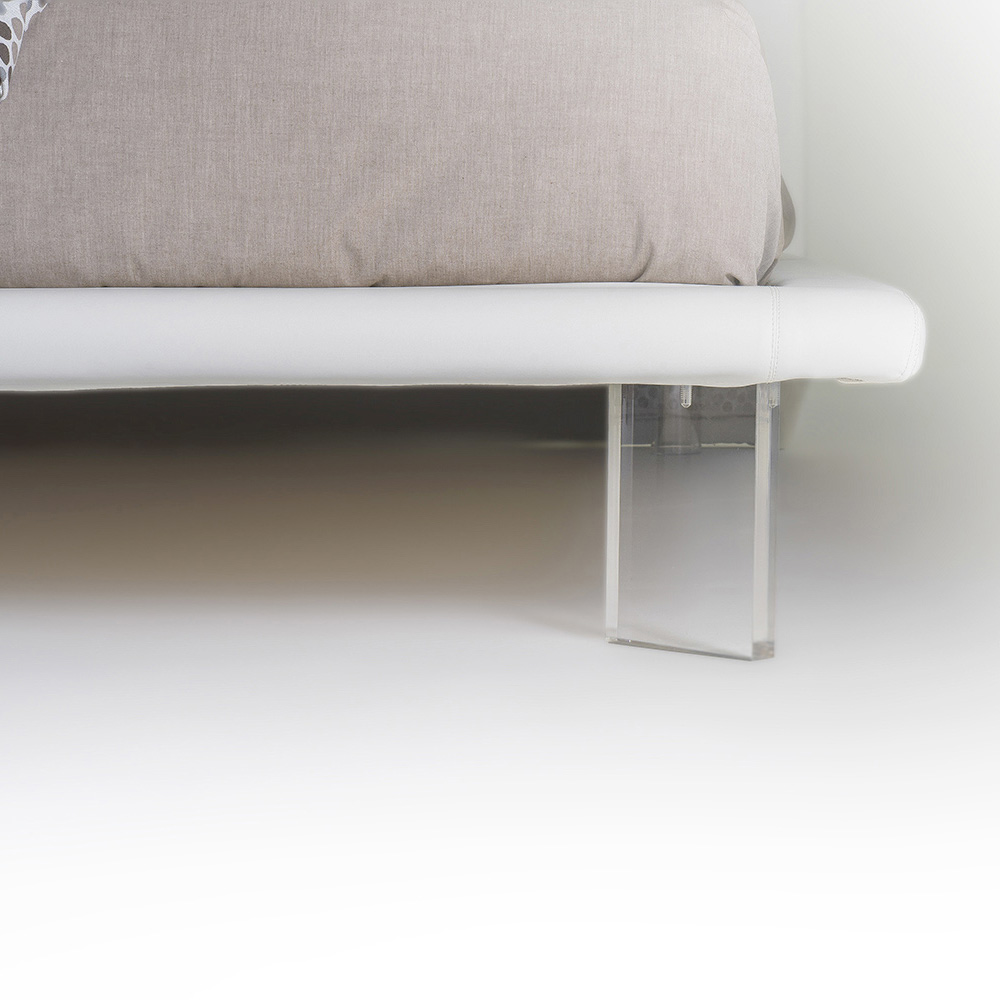 Caracteristicile deosebite sunt cusăturile perimetrale duble ale tăbliei și cadrul patului și picioarele din plexiglas care creează efectul de suspendare.