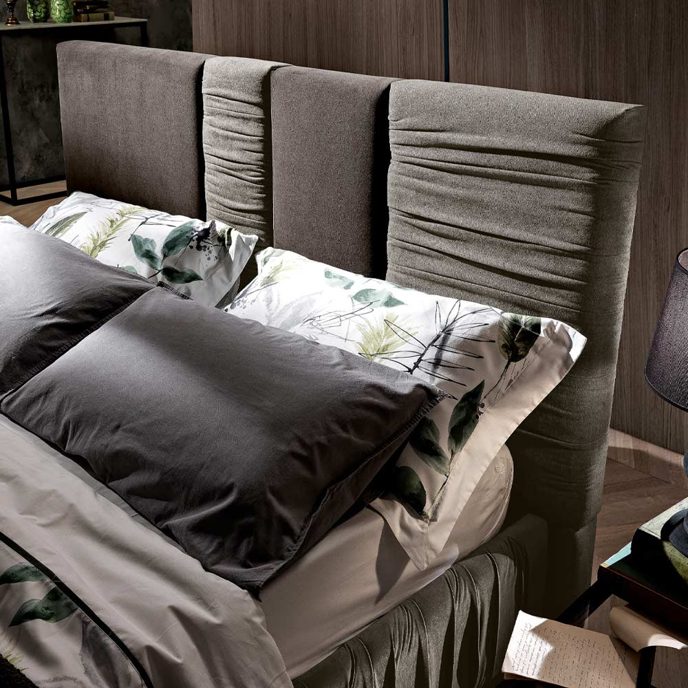 În acest pat dublu , clasica tăblie dreptunghiulară se separă în patru părți verticale de dimensiuni diferite, care alternează în combinația de țesături diferite, creând o armonie tactilă și vizuală elegantă.