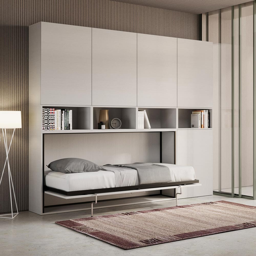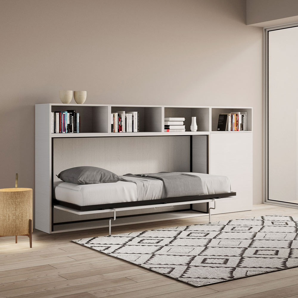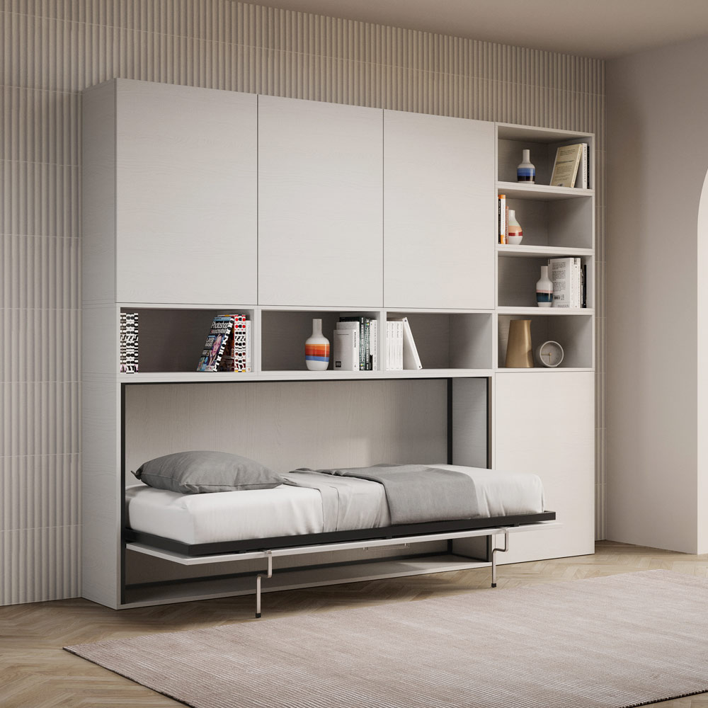 - COMPOZIȚIE G : pat pliant individual care se transformă într-o bibliotecă/dulap cu nouă compartimente (trei cu ușă și raft intern și șase deschise) - Pat închis la perete: 266,5 x 39,2 x înălțime 194,4 cm / Pat deschis: 266,5,9 x 106 x înălțime 194,4 cm
