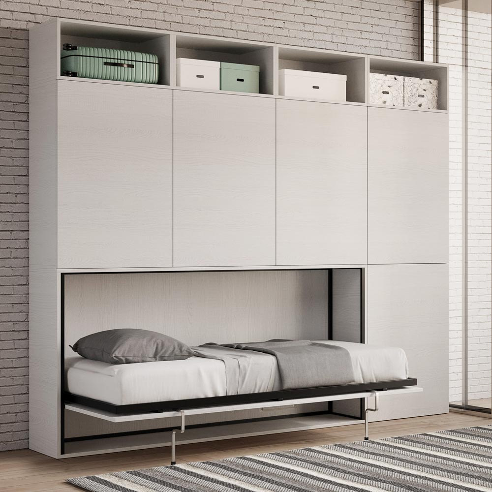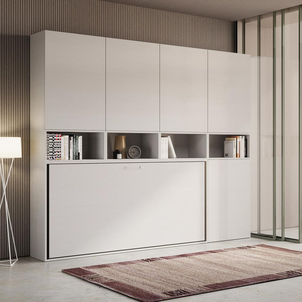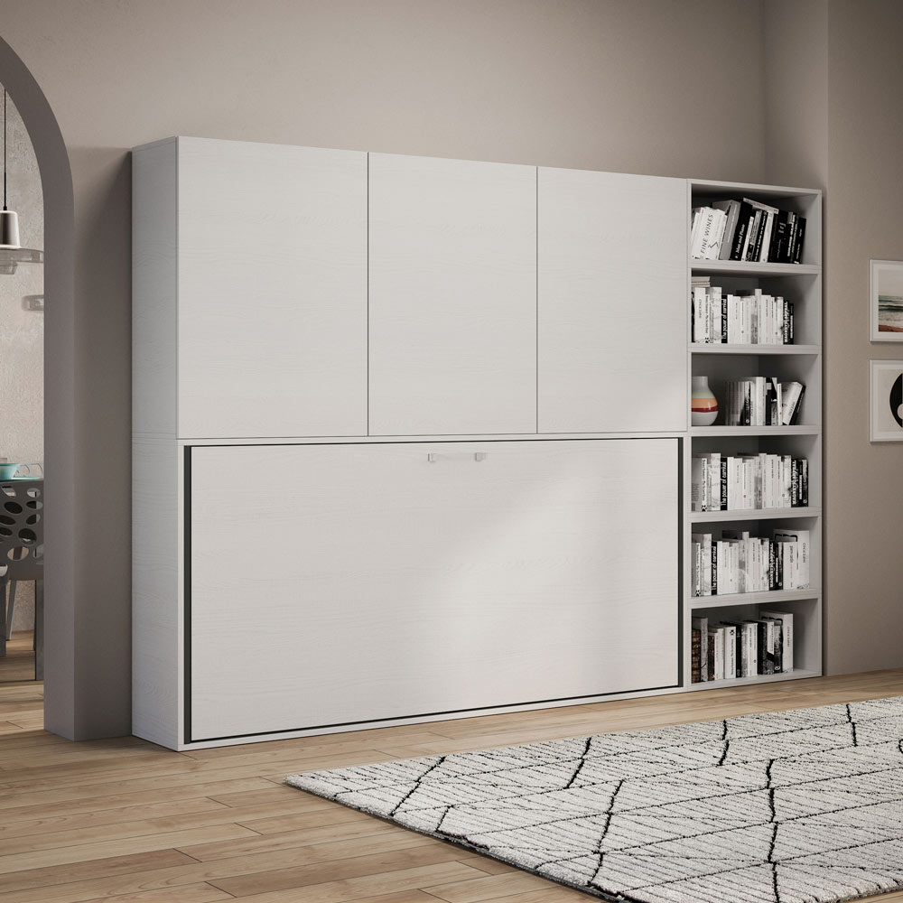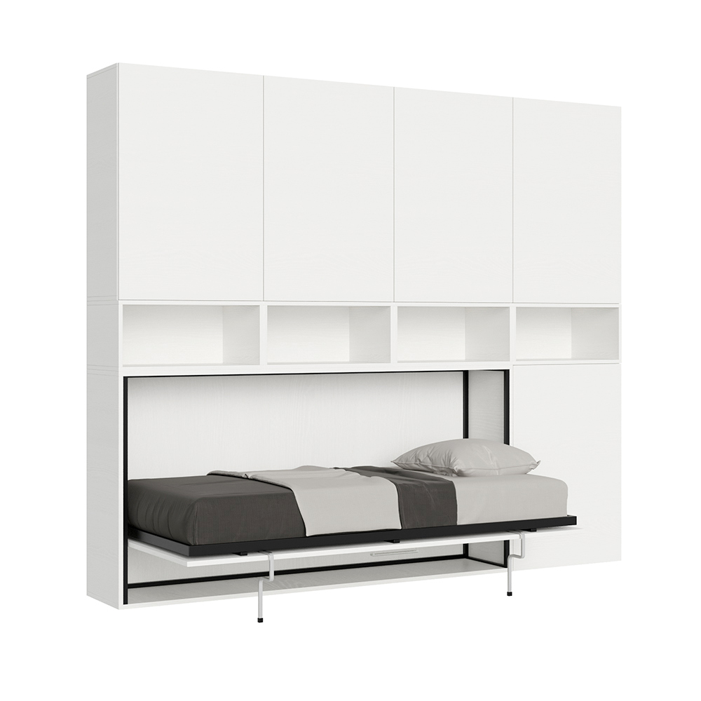 - COMPOZIȚIE G : pat pliant individual care se transformă într-o bibliotecă/dulap cu nouă compartimente (trei cu ușă și raft intern și șase deschise) - Pat închis la perete: 266,5 x 39,2 x înălțime 194,4 cm / Pat deschis: 266,5,9 x 106 x înălțime 194,4 cm