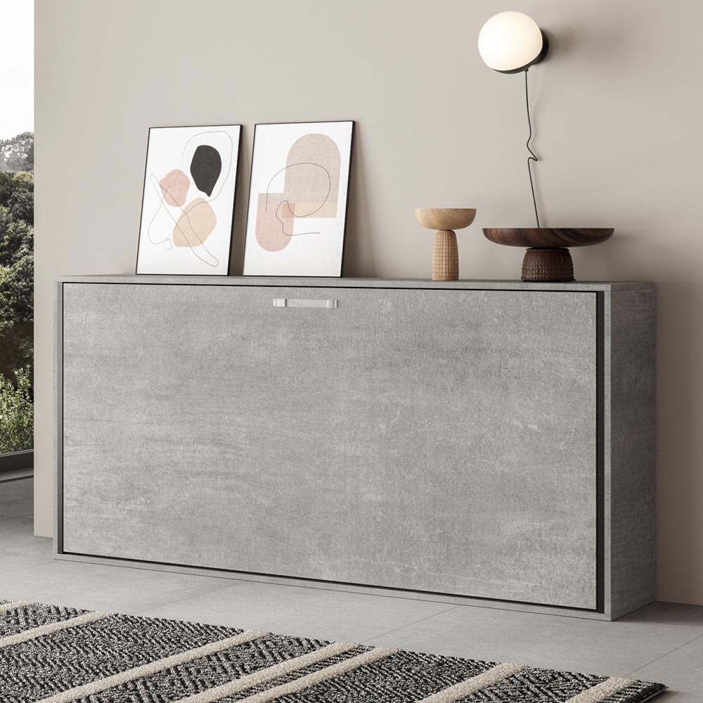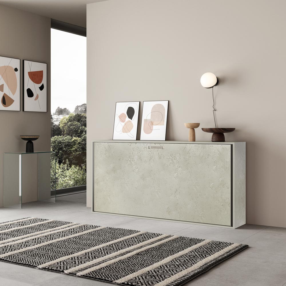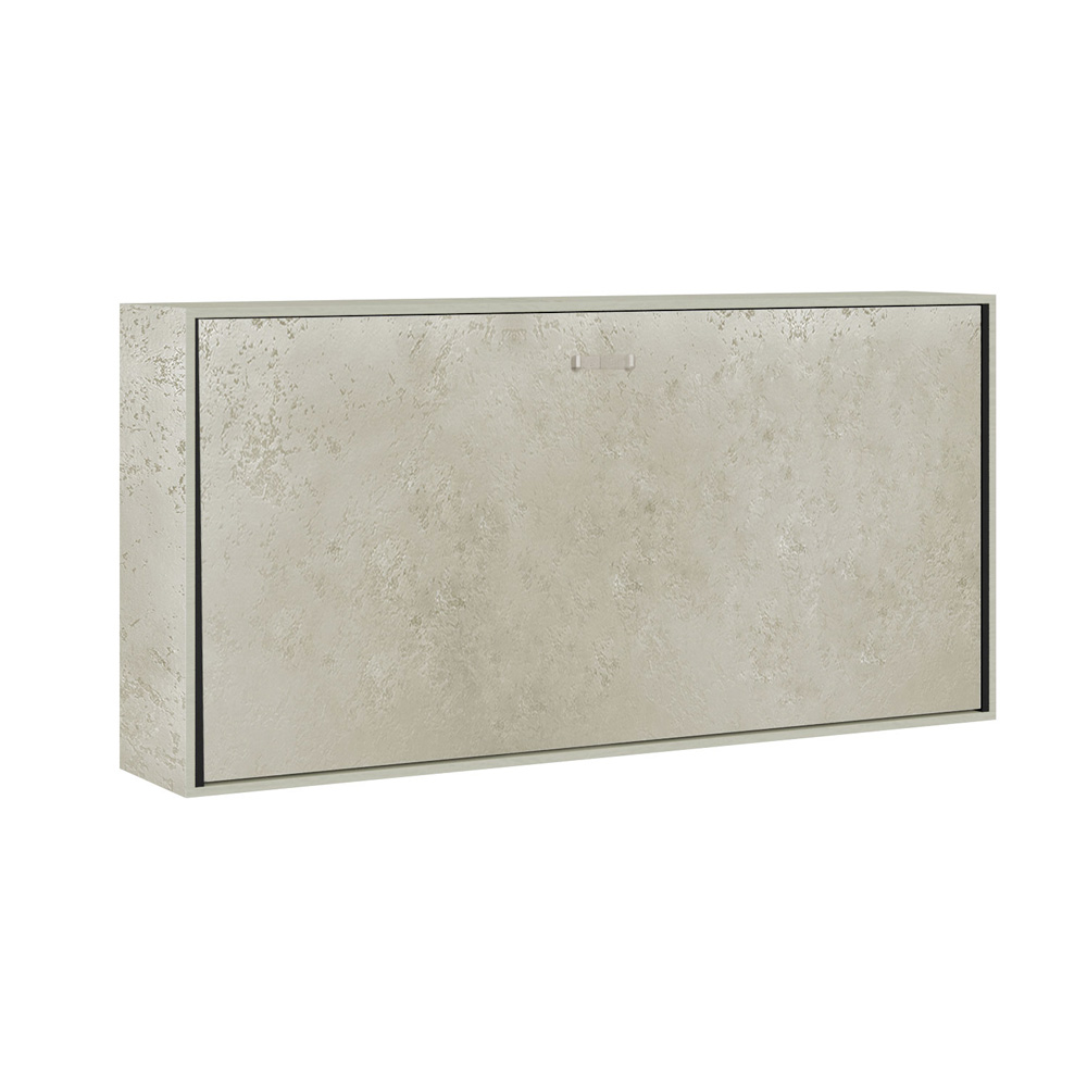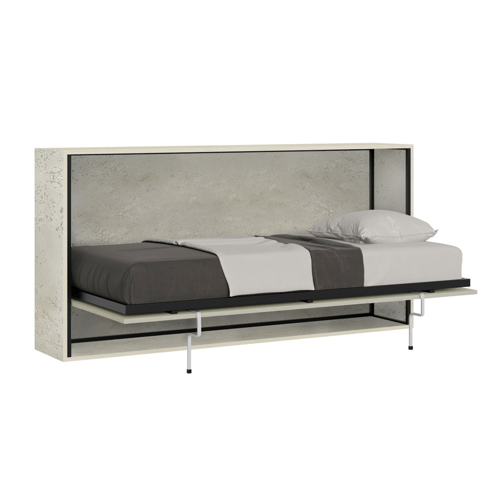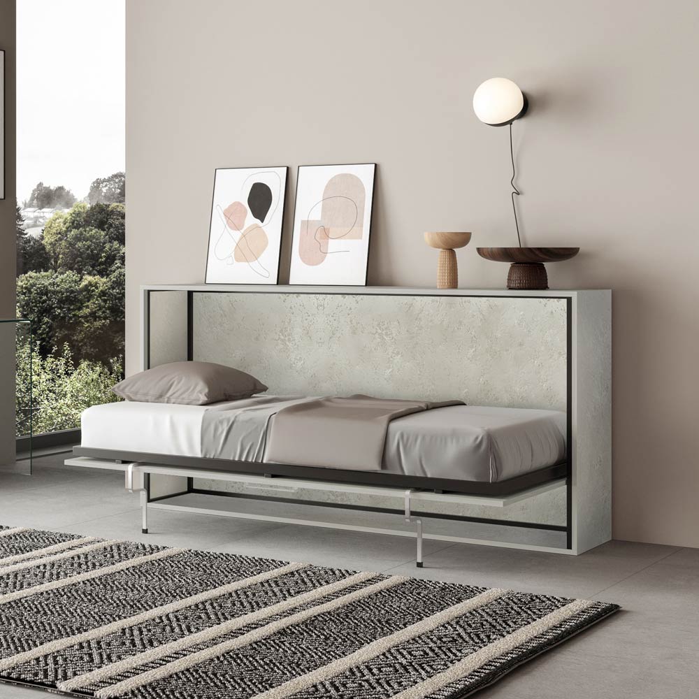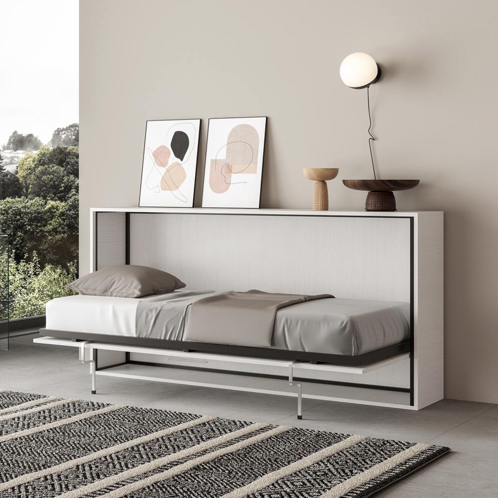 Pat pliant orizontal realizat cu o structură din panouri din PAL înnobilat cu grosimea de 18 mm, structură a bazei din fier armat vopsit cu pulbere epoxidică în culoarea aluminiului în relief.