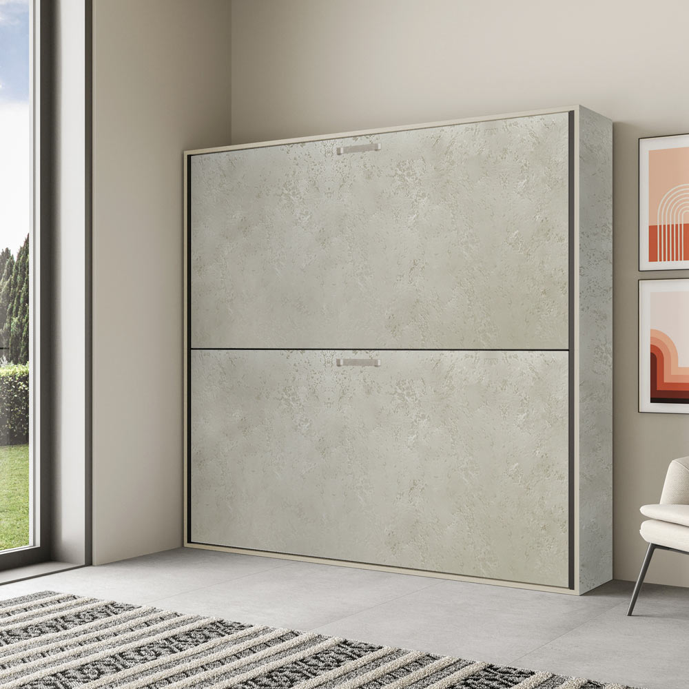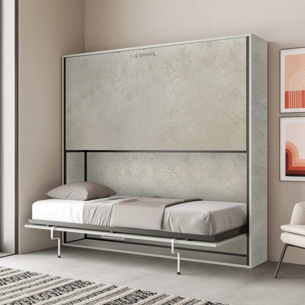Pat pliant orizontal realizat cu o structură din panouri din PAL înnobilat cu grosimea de 18 mm, structură a bazei din fier armat vopsit cu pulbere epoxidică în culoarea aluminiului în relief.