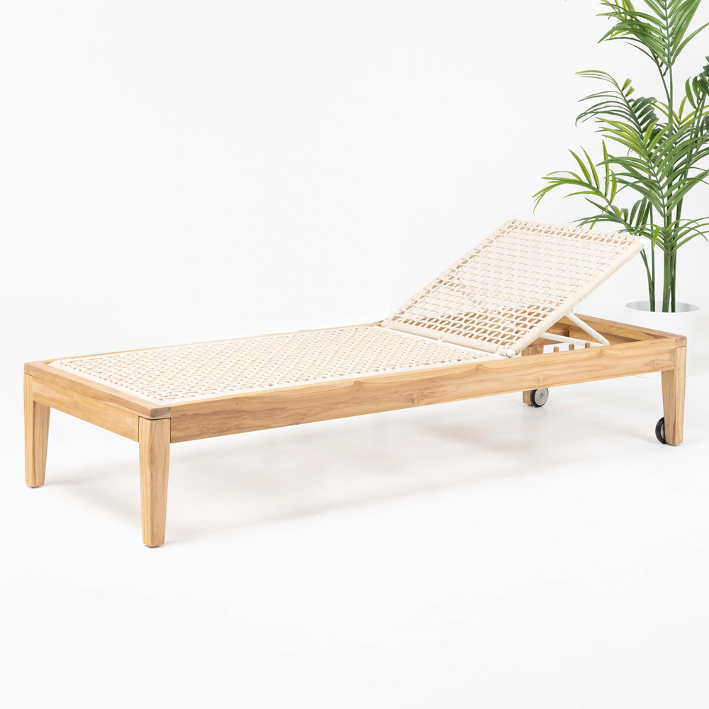 Șezlong de exterior din lemn de tec și împletitură din frânghie.