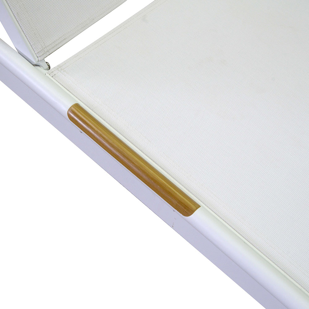 Designul elegant și minimalist este accentuat cu accente din lemn de polistiren pe cotiere, adăugând o notă de căldură și rafinament. Cu liniile sale curate și culoarea neutră, se potrivește perfect în orice decor exterior, de la piscină la terasă.