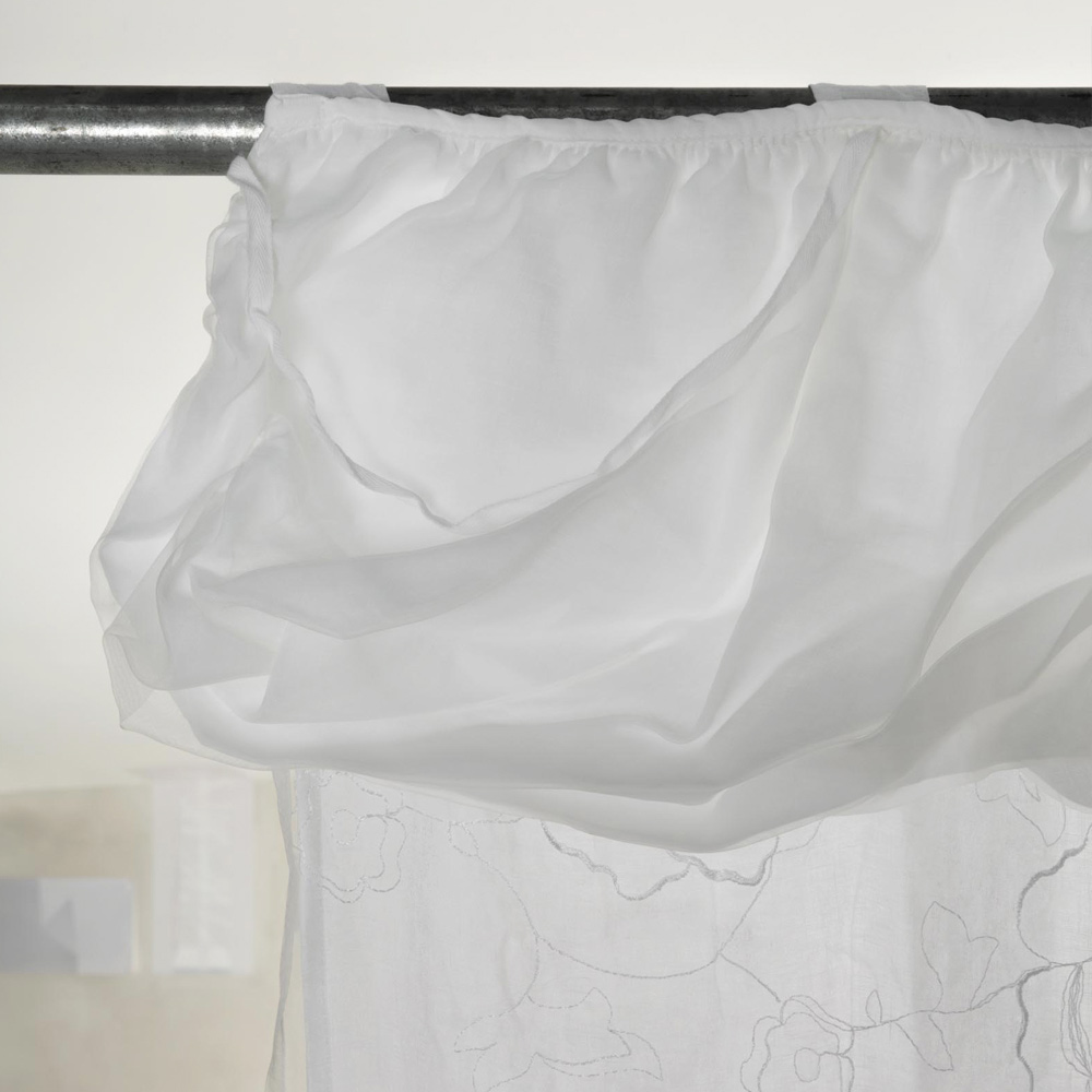 perdea albă din tifon de in și organza cu trandafiri brodați și țesătură îndoită împreună cu inele pentru lansetă.