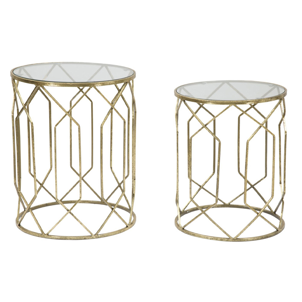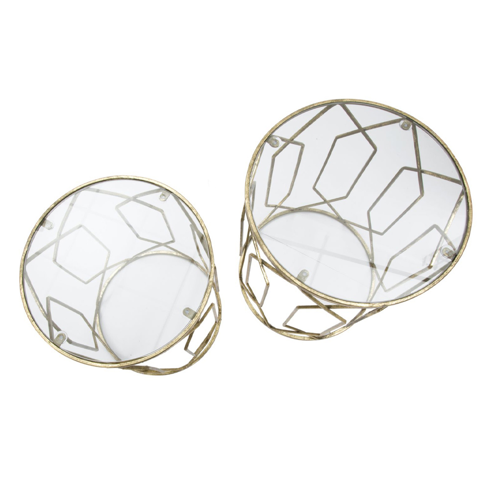 Pereche de mese de cafea din fier cu blat rotund din sticlă transparentă.