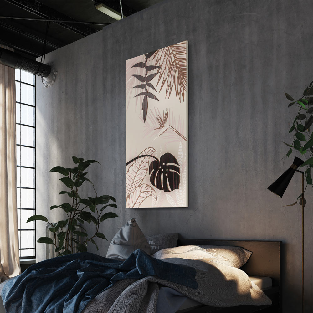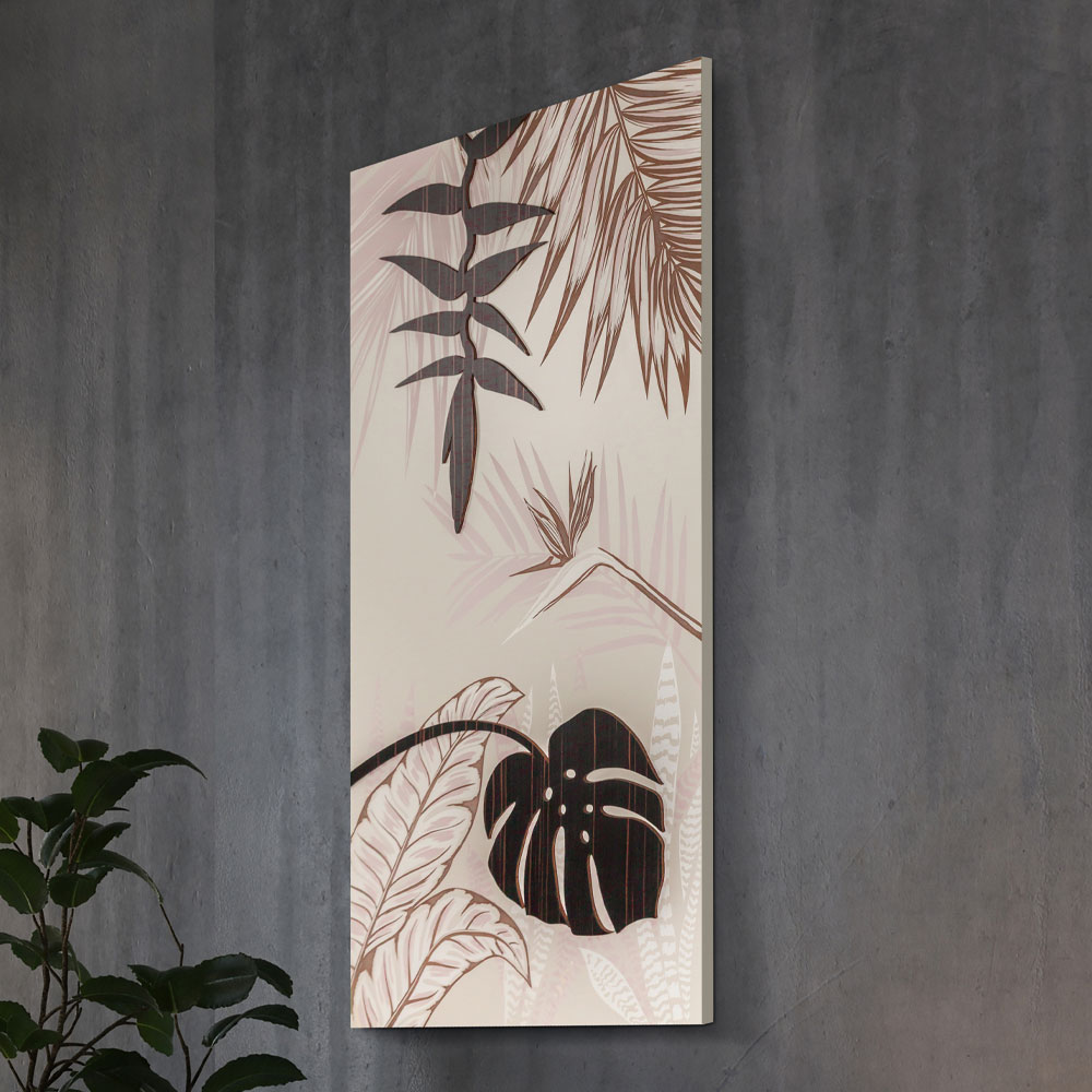 Panoul decorativ este realizat folosind tehnica de marcare cu laser care creează un basorelief pe material, creând diferite gradații de culoare ale frunzelor create pe panou. Tabloul este realizat din lemn lacuit mat nisip cu aplicatii in lemn de abanos . Celelalte culori de pe panou, precum roz, maro sunt date prin marcare cu laser.