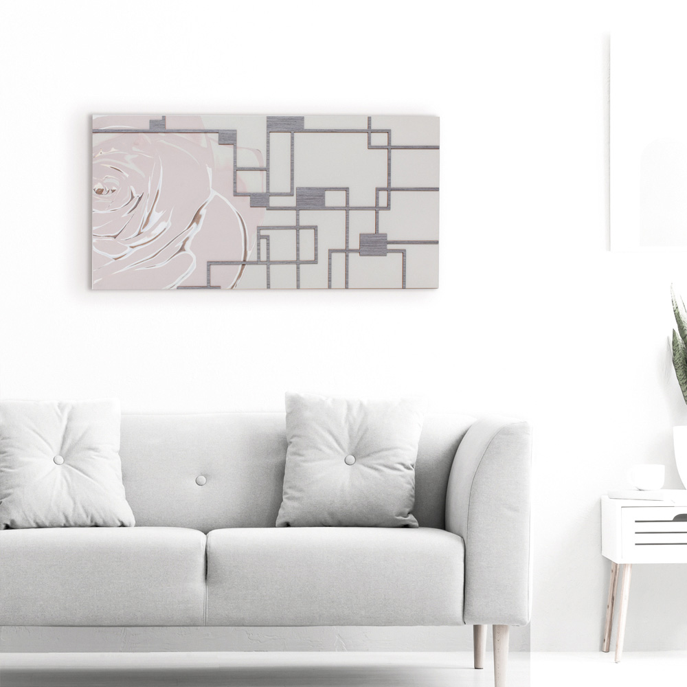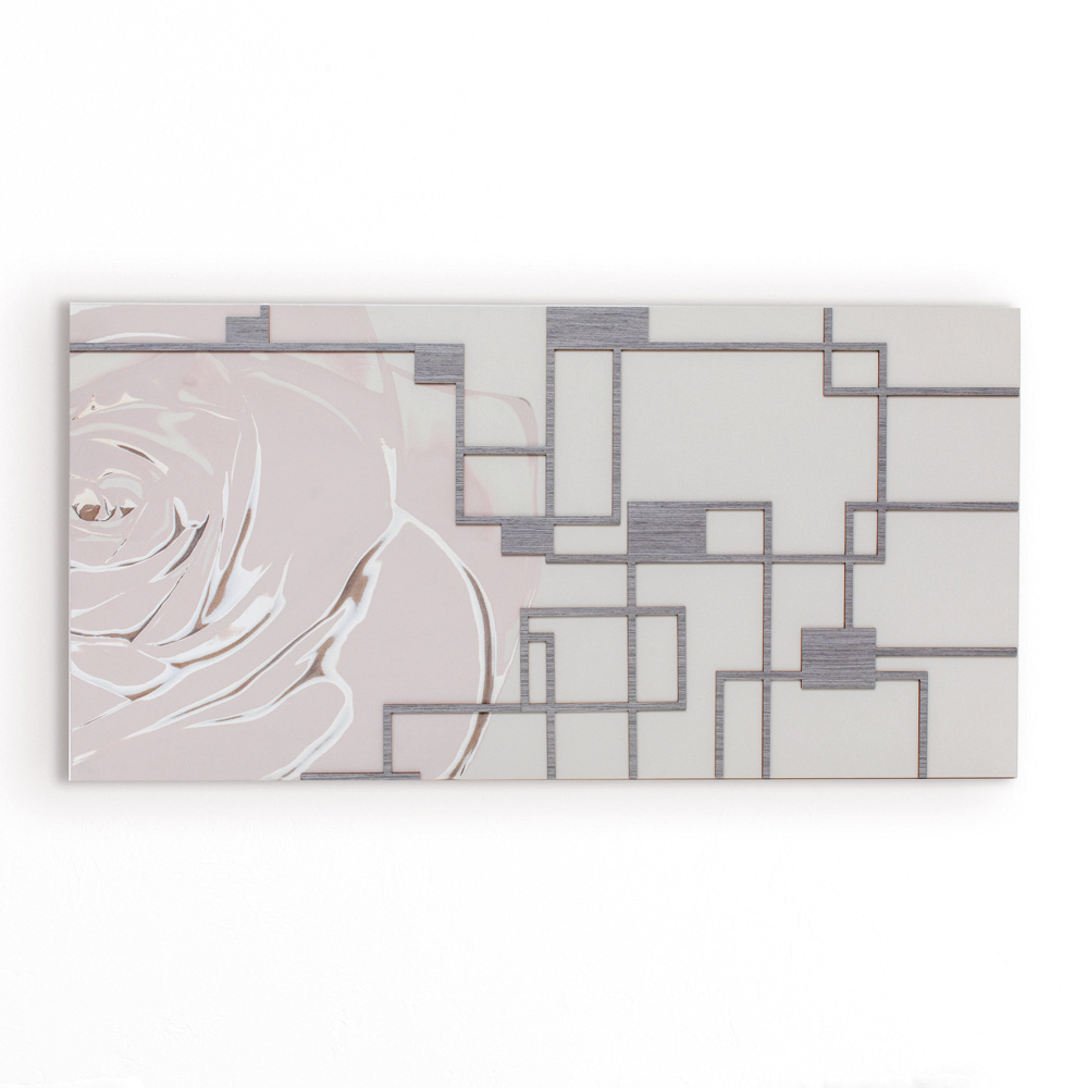 Panoul decorativ este realizat folosind tehnica de marcare cu laser care creează un basorelief pe material, creând diferite gradații de culoare ale petalelor create pe panou. Cadrul este realizat din lemn lacuit nisip cu aplicatii gri . Nuanțele moi de roz se joacă cu decorul geometric din lemn gri.