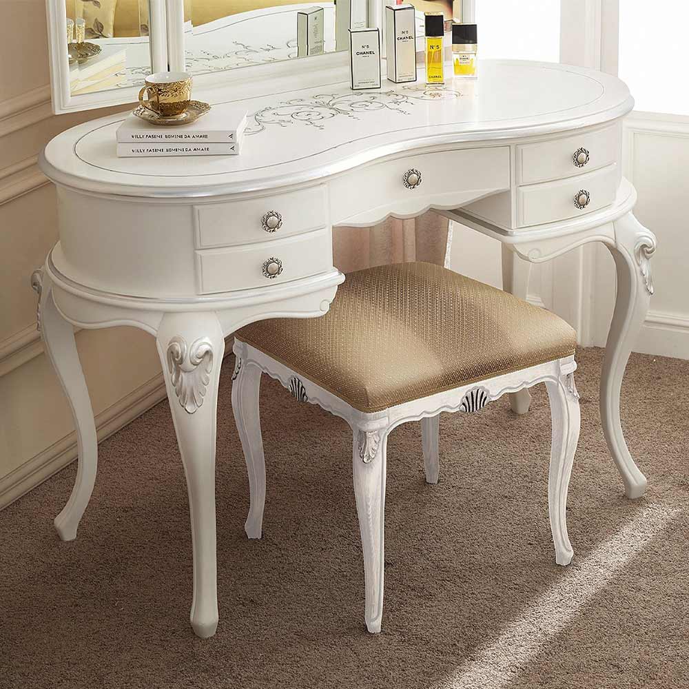 stil clasic cu 5 sertare și oglindă în formă. Fabricat din lemn și disponibil în nuc Bassano și finisaj auriu antic cu incrustații sau detalii din lemn alb și argintiu. O completare unică și rafinată,