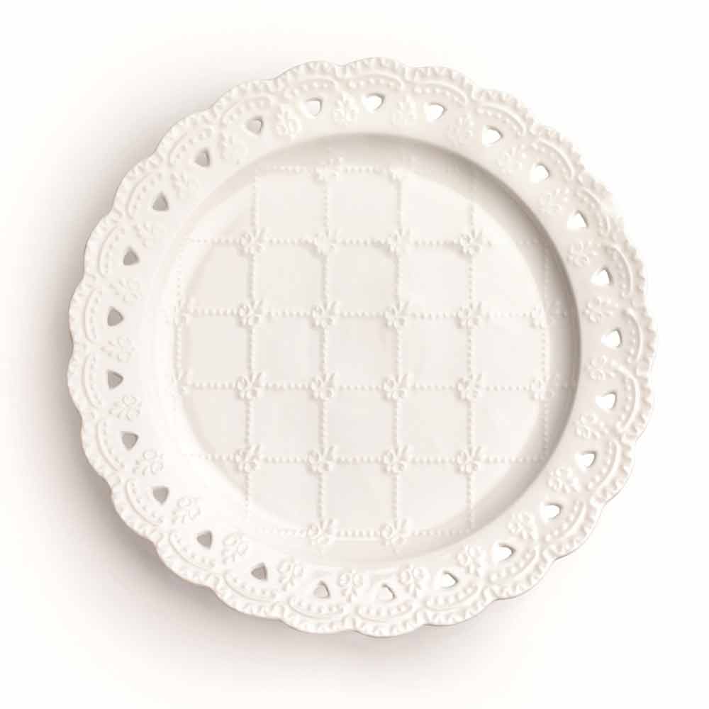 12 plăci favorizate în porțelan alb, cu decorațiuni prețioase în relief și motive străpunse manual, de două dimensiuni.