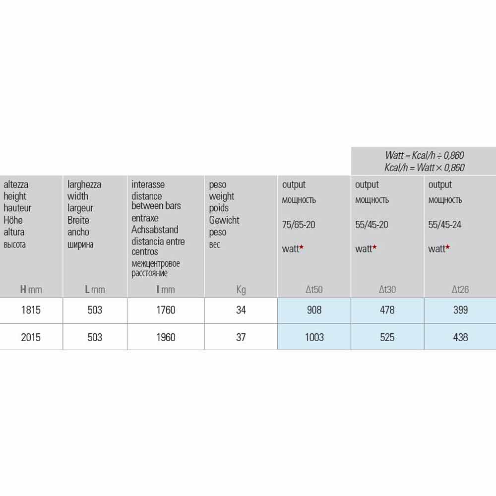 - H 2015 x L 503 x Inter. 1960 mm x Randament w (Δt50 *) 1003; Randament w (Δt30 *) 525; Randament w (Δt26 *) 438