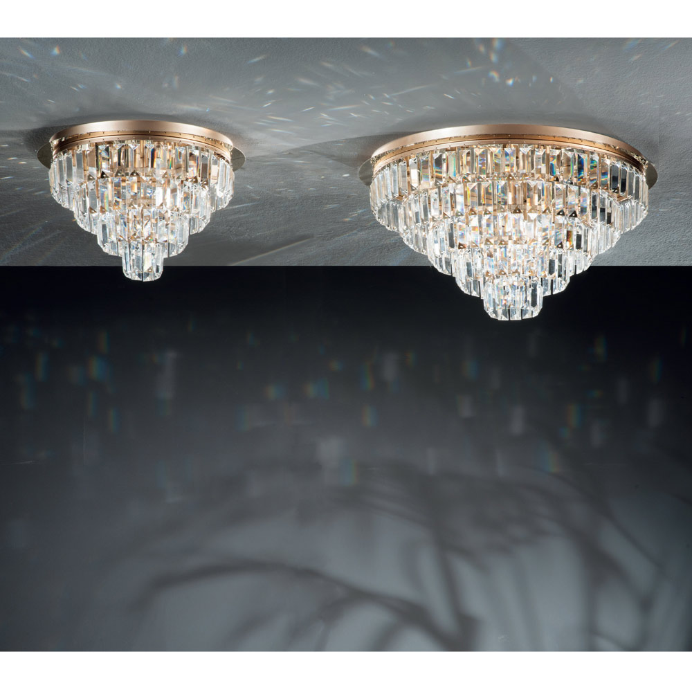 Disponibil in doua marimi, are o structura metalica aurie iar punctul forte este dat de pandantivele din cristal care decoreaza, luminand orice mediu cu gust si caracter, intr-un mix de stil, clasa si inovatie.